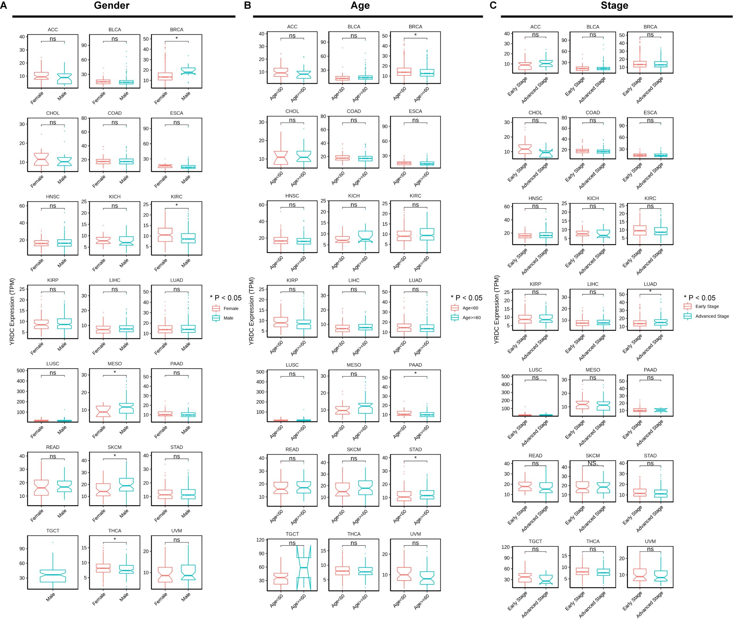 It was firstly reported that the high level of YRDC resulted in a worse prognosis for patients with 10 tumors (BLCA, BRCA, CHOL, HNSC, KICH, LIHC, LUAD, MESO, SKCM and THCA). The expression profiles in breast invasive carcinoma, cholangiocarcinoma, head and neck squamous cell carcinoma, liver hepatocellular carcinoma, and lung adenocarcinoma were consistent with prognostic values. In COAD and KIRC patients, overexpressed YRDC independently predicted a better prognosis.