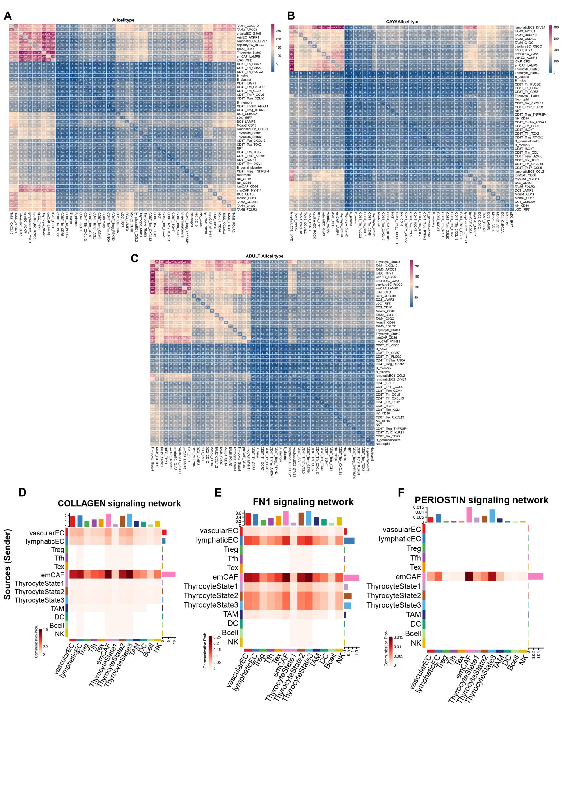 Next, we performed CellChat analysis to identify cell–cell interactions in the PTC TME. Focusing on the interactions involving CAFs, we first investigated the connections with thyrocytes, ECs, and immune cells. It appears that emCAF, vascular EC, lymphatic EC, and thyrocyte State 3 mediated the most efferent and afferent events from other subpopulations, possibly representing a signaling center and secretory hub within the tumor (Figure advs71040-fig-0007). Most importantly, emCAF interacted with thyrocyte State 3 in EMT related signaling pathway in COLLAGEN, FN1, and PERIOSTIN (Figure S8D–F, Supporting Information). emCAFs expressed the highest ligands in COLLAGEN pathway, such as COL6A1‐3 and COL1A1‐2. They also highly expressed ligands involved in downstream pathways, including GP6, ITGA3_ITGB1, SDC2, and SDC1 (Figure 7B). emCAF subclusters seem to provide costimulatory signals to thyrocyte State 3 cells through ANGPTL4‐CDH11/(ITGAV_ITGB3) and TGFB3‐(ACVR1_TGFbR)/(TGFbR1_R2) interactions. Potential VEGFC‐(FLT4/KDR) interaction was detected between vascular EC and thyrocyte State 3. Additionally, stronger coinhibitory signals from lymphatic EC to thyrocyte State 3 and emCAF cells were likely mediated by the CCL21‐ACKR4 and CCL21‐CCR7 axes (Figure 7B).