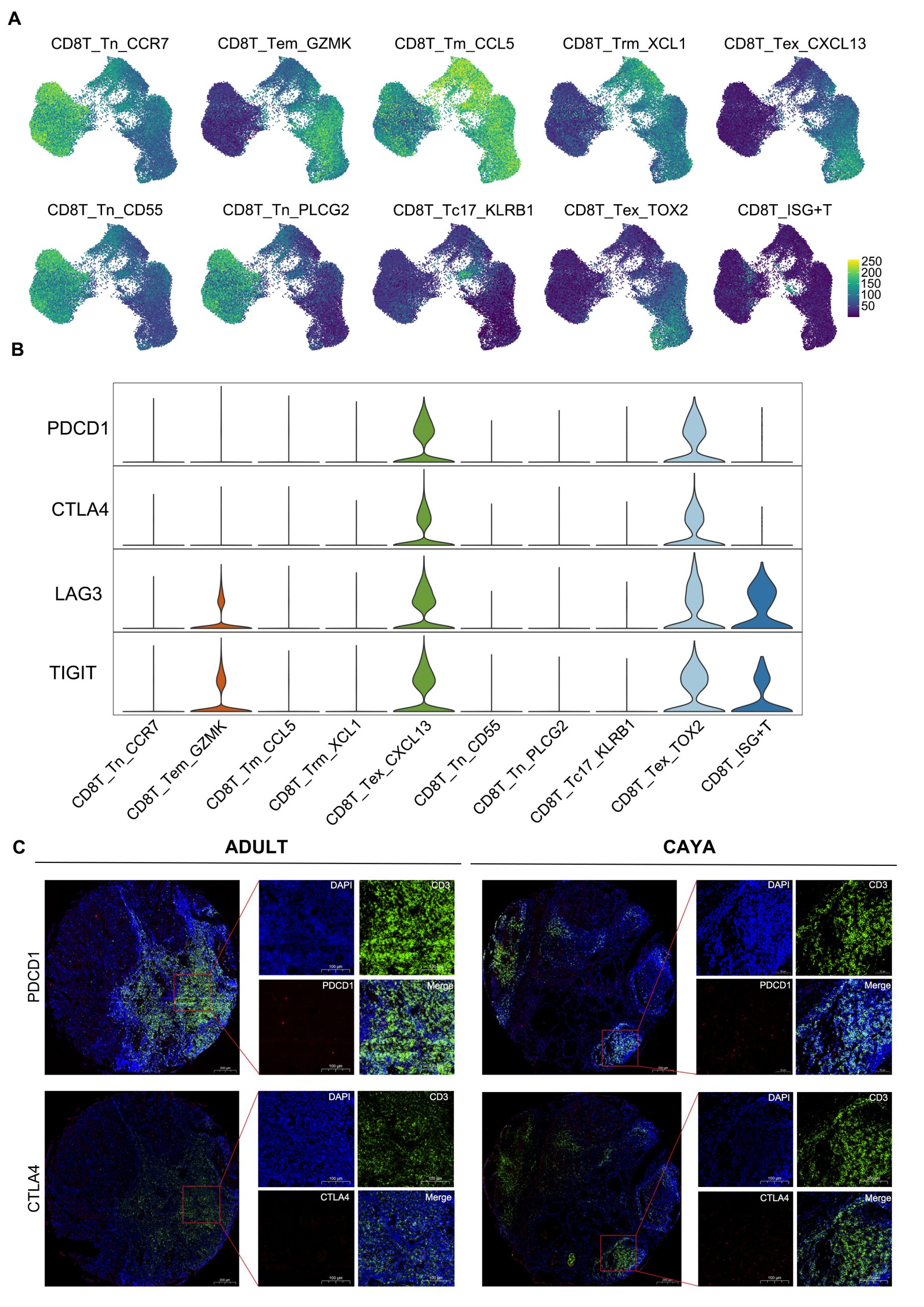 Next, we conducted a pseudotime trajectory analysis on CD8+ T cells using the Monocle 3[ ref. advs71040-bib-0015 ] (Figure 3C). Along the pseudotime trajectory, we observed that cytotoxicity‐related genes (e.g., KLRG1, GNLY, and GZMH) were gradually downregulated while dysfunction‐related genes (e.g., CTLA4, LAG3) were gradually upregulated[ ref. advs71040-bib-0014, ref. advs71040-bib-0023, ref. advs71040-bib-0024 ] (Figure 3D). This pseudotime trajectory recapitulated the progression of CD8+ T cells from a cytotoxic state through a predysfunctional state to a fully dysfunctional state, along with an escalating degree of exhaustion. We further investigated the transcriptional changes associated with transitional states and categorized the CD8+ T cell clusters into three phases (Figure 3E). CD8T_Tn cells (including Tn_CCR7, Tn_CD55, and Tn_PLCG2) were predominantly in state 3, characterized by upregulated expression of CCR7, ANXA1, TCF7, LEF1, and KLF2, indicating the lowest cytotoxic capacities.[ ref. advs71040-bib-0018, ref. advs71040-bib-0025 ] In another trajectory branch (state 2), CD8+ T cells progressed from Tnaive‐Tc17 to Tem and then to Tex. STARTRAC pairwise transition analysis based on TCR sharing further confirmed that Tem_GZMK cells have a strong propensity to transition into Tex cells, supporting the hypothesis that CD8+GZMK+T cells, considered a “pre‐exhausted” state within tumors, can progress into terminally exhausted T cells (Figure 3G).[ ref. advs71040-bib-0026, ref. advs71040-bib-0027 ] Cells in the end of trajectory demonstrated the highest expression levels of PDCD1, LAG3, NFATC1, and CXCR5, positively correlated with TOX2.[ ref. advs71040-bib-0028, ref. advs71040-bib-0029 ] Conversely, IL2, IFNG, and HAVCR2, negative correlated with TOX2, were downregulated during pseudotime. Notably, the expression of these Tex‐related genes was higher in CAYA patients than in adults, indicating a stronger suppressive role of Tex in CAYA patients (Figure 3F). Similar to CD4+ T cells, cytotoxicity score (0.003 ± 0.352 vs −0.08 ± 0.345) was higher in adult patients, while exhaustion (0.031 ± 0.173 vs 0.046 ± 0.179), apoptosis (0.084 ± 0.03 vs 0.136 ± 0.03), and migration (0.061 ± 0.036 vs 0.1 ± 0.032) score were higher in CAYA group (Figure 3H). Among them, important indicators related to exhaustion, such as PDCD1, CTLA4, and LAG3 were mainly highly expressed in Tex and pediatric cases (Figure 3I; Figure S3B, Supporting Information). The results were verified by mxIHC of PDCD1/CD3 and CTLA4/CD3 (Figure S3C, Supporting Information). More importantly, through Scenic analysis, we found that SMAD1, BACH1, and IRF4 were enriched in Tex cells, and may play an important role specifically in terminally exhausted T cells (Figure 3J).