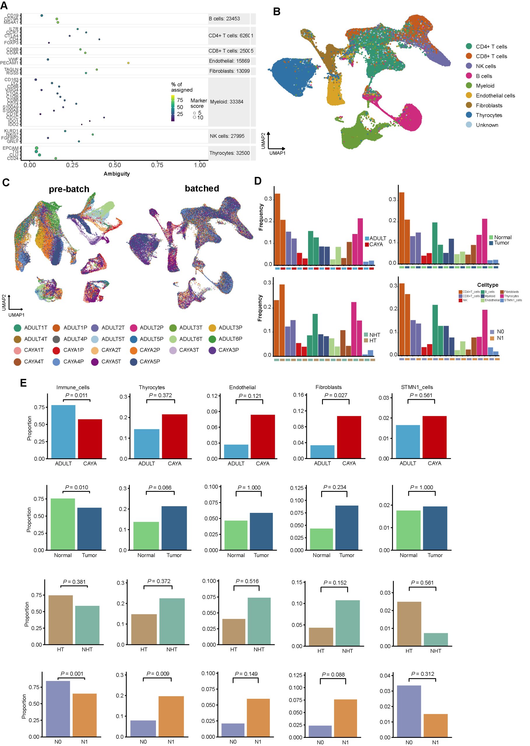 Preliminary cell clustering was performed using a shared nearest neighbor modularity optimization‐based clustering algorithm. After removing the batch effect, the major cell type and lineage of each cluster were determined based on the expression of canonical markers (Figure S1C, Supporting Information). In total, we identified 40 053 CD4+ T cells (27.92%), 19 534 CD8+ T cells (13.61%), 6547 NK cells (4.56%); 20 159 B cells (14.05%), 12 439 myeloid cells (8.67%), 7133 endothelial cells (4.97%), 8338 cancer‐associated fibroblasts (CAFs) (5.81%), 26 933 thyrocyte cells (18.77%), and 2341 STMN1 cells (1.63%) (Figure 1C). Furthermore, based on top differentially expressed genes, we identified unique markers for each of the 32 major clusters (Figure 1D) and used the machine‐learning algorithm “Garnett” to assign signatures to each cluster (Figure S1A,B, Supporting Information). To further verify the reliability of clustering, we projected key gene scores onto the uniform manifold approximation and projection (UMAP) using Ucell, and the results were consistent with our clustering (Figure 1E; Table S2, Supporting Information). This allowed us to develop a cluster‐agnostic approach for cell‐type annotation. For each individual sample, the proportion of thyrocyte cell types was highly variable, with CD4+ T cells being the most dominant cell type within the TME of PTC, followed by B cells, CD8+ T cells, myeloid cells, fibroblasts, NK cells, and endothelial cells (Figure 1F). We also discovered distinct fibroblast and myeloid cells, as well as B cells and CD4+ T cells, in the tumor and adjacent normal tissue (Figure 1G; Figure S1D,E and Excel S4, Supporting Information). Notably, cancer‐associated fibroblast cells and endothelial cells were specifically enriched in CAYA patients, while CD4+/CD8+ T cells, NK cells, and B cells were predominantly present in adult patients (Figure 1G; Figure S1D,E, Supporting Information). Overall, our comprehensive analysis of 143 477 single cells from normal and tumor tissue of the human thyroid provides an unprecedented opportunity to compare this atlas across subgroups.