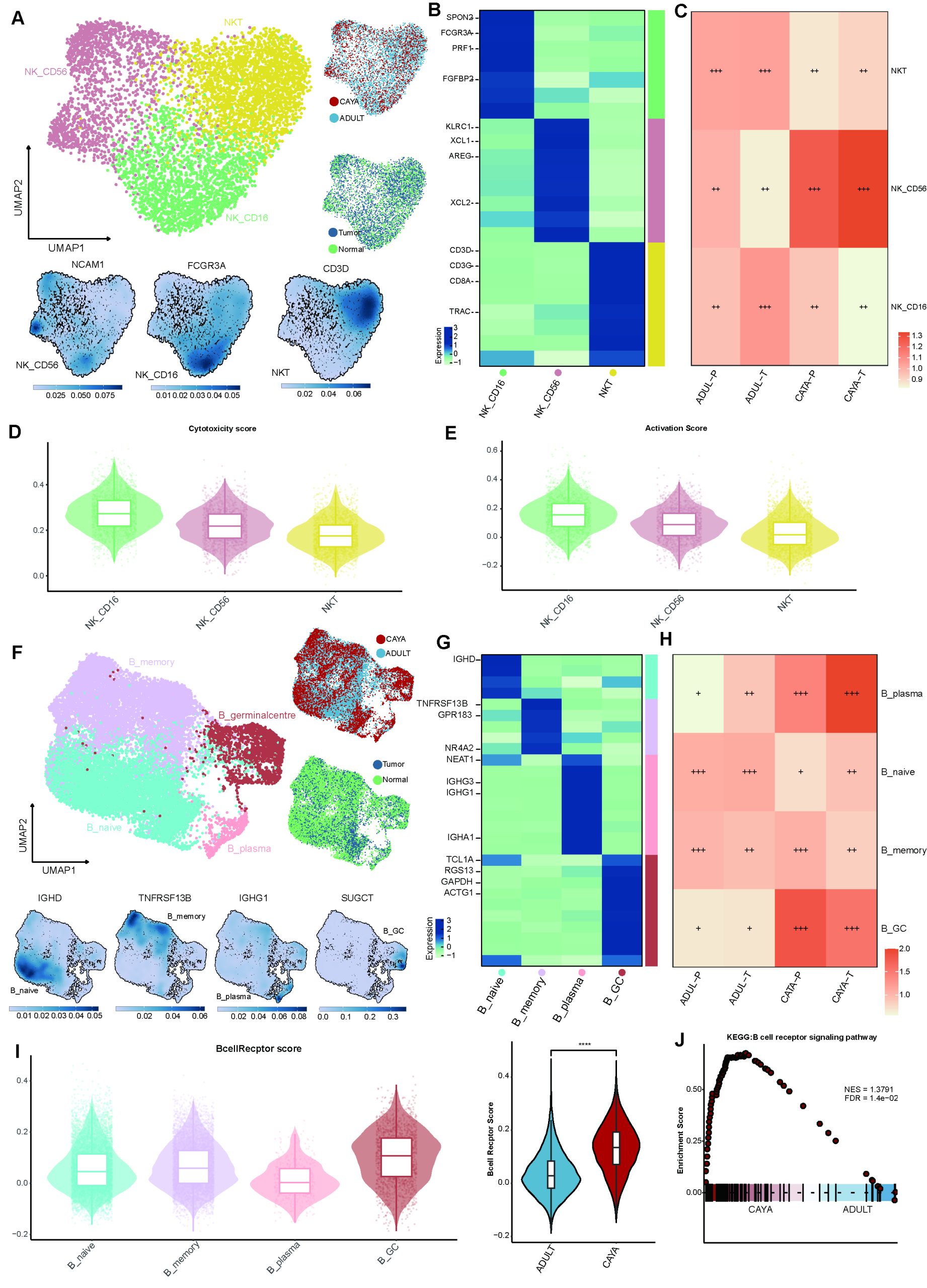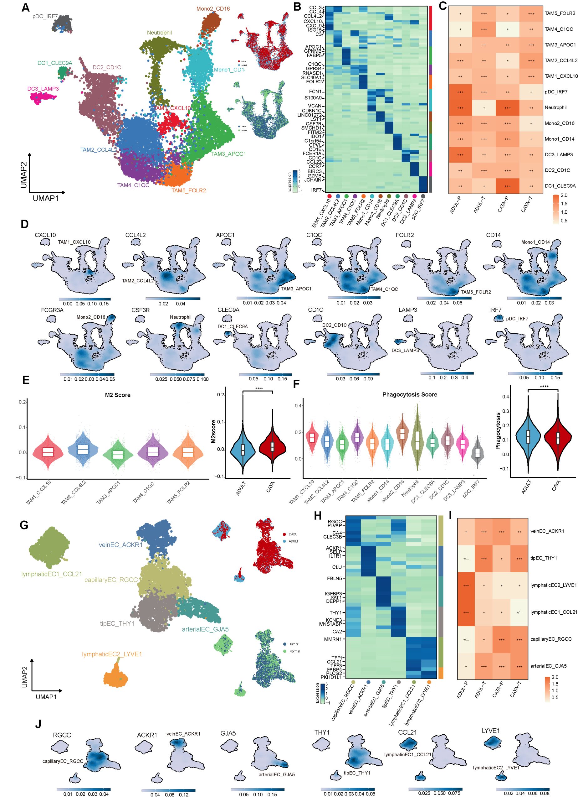 Since we observed remarkable divergence between CAYA and adult patient ecosystems, we set out to identify disease‐specific cell types in further depth. Subclustering of NK cells led to the identification of 3 clusters including NK_CD56, NK_CD16, and NKT, with NK_CD56 cells dominating in CAYA tumor tissues but showing lower cytotoxicity and activation score, potentially contributing to the higher metastatic tendency in children (Figures S4A–E and S6 and Table S3, Supporting Information). Subclustering of B cells identified 4 distinct clusters: B_naive, B_memory, B_GC, and B_plasma. B_naive cells were more abundant in adult tumor tissues and adjacent normal tissues compared to those from CAYA patients. In contrast, B_plasma and B_GC cells were more enriched in CAYA tumor and adjacent tissues than in adults (Figures S4F–H and S6 and Table S3, Supporting Information). B cell receptor score (BRs) in the germinal center demonstrated the highest level, followed by B memory cells. The BRs of CAYA patients were significantly higher than those of adults (Figure S4I, Supporting Information). Kyoto Encyclopedia of Genes and Genomes (KEGG) pathway analysis also indicated that the B cell receptor signaling pathway in CAYA was significantly more active than that in adults (Figure S4J, Supporting Information). Subclustering of myeloid identified 12 clusters clearly delineating macrophage, monocyte, dendritic cells, and neutrophil cells. Tumor‐associated macrophage (TAM) exhibited higher infiltration in tumor tissues than in normal tissues (Figure S5A–D, Supporting Information; Figure 6C). Flow cytometry showed that the proportion of CD206+M2 cells in CAYA‐PTC tumor tissues (64.9 ± 17.9%) was significantly higher than in adults (35.4 ± 11.2%, P < 0.05), and significantly higher than in adjacent tissues (9.9 ± 7.4%, P < 0.05) (Figure S6 and Table S3, Supporting Information). TAM5_FOLR2 had high M2 score and low phagocytic score, indicating TAM5_FOLR2 is located at the end of macrophage differentiation (Figure S5E,F, Supporting Information). The M2 score of CAYA patients is higher than that of adults, but the phagocytic score is lower (Figure S5E,F, Supporting Information). This suggests that myeloid cells in children have insufficient phagocytic ability and a tendency to favor M2 cells related to tumor suppression, which is an important factor in the tendency of CAYA patients to metastasize. Subclustering of endothelial cells (ECs) identified six clusters, mainly categorized into vascular and lymphatic endothelium, showed increased infiltration of capillary EC cells in CAYA tumors, likely contributing to angiogenesis (Figure S5G–J, Supporting Information). Overall, immune cell infiltration profiles, particularly involving NK and myeloid cells, highlighting the unique tumor microenvironment and may influence tumor progression and metastasis in pediatric patients.