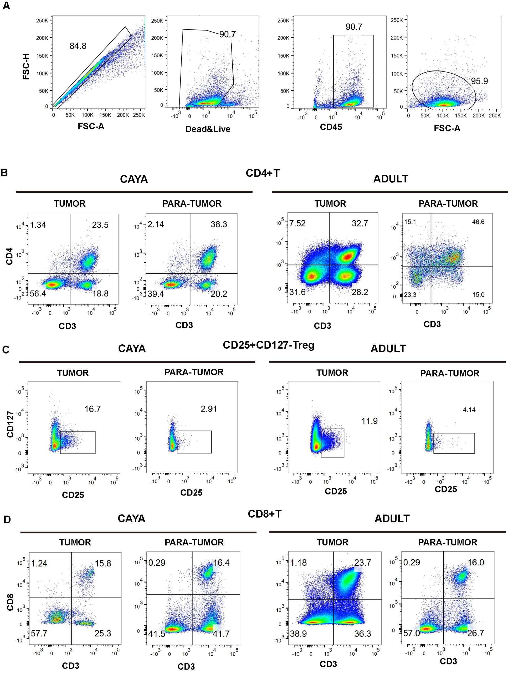 Briefly, tumor and paratumor tissues were cut into small pieces below 1 mm3 using sterile scissors and tweezers and digested at 37 °C for 15 min with 1 mg mL−1 Collagenase IV and 0.1 mg mL−1 DNase I (Roche) on rotary shaker. Digestion was stopped by RPMI‐1640 (with 5% fetal bovine serum (FBS)) and cells were filtrated through 70 µm cell strainers and washed twice with 2 mL PBS. Cells were resuspended in the staining buffer and stained with following antibodies on ice for 30 min: anti‐CD45 (563204, BD Pharmingen, USA), anti‐CD11B (557396, BD Pharmingen, USA), anti‐CD68 (564943, BD Pharmingen, USA), anti‐CD86 (555660, BD Pharmingen, USA), anti‐CD206 (555954, BD Pharmingen, USA), anti‐CD3 (557943, BD Pharmingen, USA), anti‐CD19 (561742, BD Pharmingen, USA), anti‐CD4 (566320, BD Pharmingen, USA), anti‐CD8 (555635, BD Pharmingen, USA), anti‐CD25 (562443, BD Pharmingen, USA), anti‐CD127 (560822, BD Pharmingen, USA), anti‐CD14 (555397, BD Pharmingen, USA), anti‐HLA‐DR (555812, BD Pharmingen, USA), anti‐CD11C (562561, BD Pharmingen, USA), anti‐CD123 (17‐1239‐42, BD Pharmingen, USA), anti‐CD56 (566400, BD Pharmingen, USA), and anti‐CD16 (563690, BD Pharmingen, USA). Prior to flow cytometry, DAPI was added to cell suspension (Sigma #D8417, 1 µg mL−1). The signal was detected via the PE channel. Cells were maintained at 4 °C and analyzed on Cytek Aurora flow cytometer (Cytek Biosciences). Data were collected in SpectroFlo (v.3.0.0) and analyzed in FlowJo (v.10.6.2).