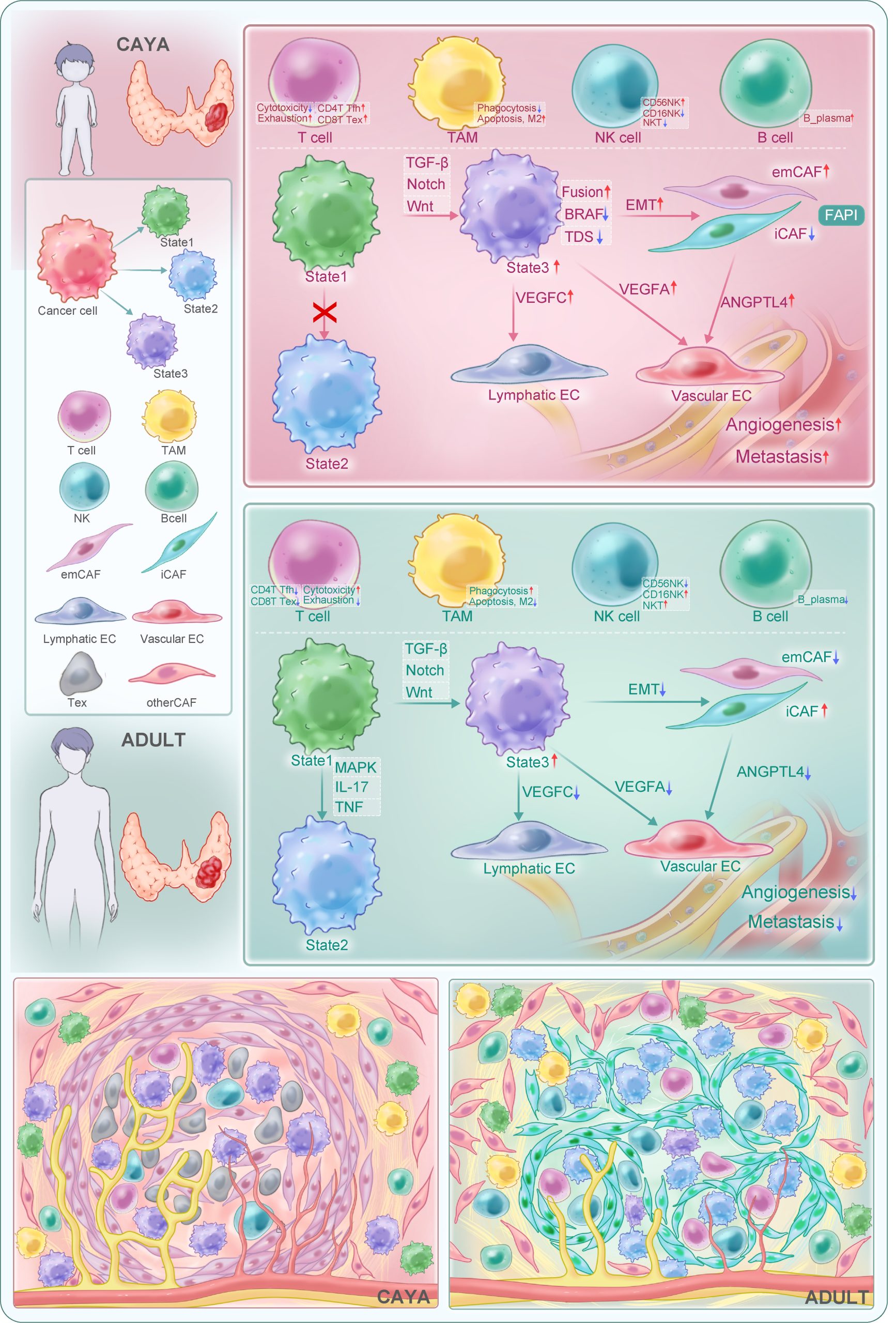 Papillary thyroid cancer (PTC), constituting the predominant histological subtype among thyroid malignancies, is characterized by its heterogeneous clinical behavior and complex molecular landscape.[ ref. advs71040-bib-0001 ] In children and young adults (CAYA‐PTC), the clinical presentation and tumor behavior are significantly more aggressive than in adult patients (Adult‐PTC), manifesting as larger tumor sizes, earlier capsule involvement, and more extensive lymph node metastases.[ ref. advs71040-bib-0002, ref. advs71040-bib-0003 ] These differences warrant thorough investigation and discussion. While substantial progress has been made in deciphering the genomic alterations within PTC cells, the tumor microenvironment (TME) remains a pivotal yet enigmatic player in disease progression. The intricate interplay between cancer cells and the cellular components of the TME, including fibroblasts, immune cells, and vasculature, plays a crucial role in shaping the phenotypic diversity and therapeutic response of thyroid cancer.[ ref. advs71040-bib-0004, ref. advs71040-bib-0005, ref. advs71040-bib-0006 ] Some studies have reported a correlation between clinical outcomes and tumor‐infiltrating immune cells in thyroid cancer patients. For instance, BRAFV600E promotes thyroid cancer development by increasing the penetrance of myeloid‐derived suppressor cells, which exhibit strong immunosuppressive potential and are associated with a poor prognosis.[ ref. advs71040-bib-0007 ] Furthermore, distinct transcriptional and functional changes in myeloid cells arise before their infiltration into the tumor and are initiated in bone marrow, suggesting an active role in forming the tumor immune microenvironment.[ ref. advs71040-bib-0008 ] M2‐macrophages downregulate METTL3 in the thyroid cancer cells, leading to the stabilization and increase of CD70, which results in a higher proportion of regulatory T cells (Tregs) and terminally exhausted T cells.[ ref. advs71040-bib-0009 ] Additionally, the infiltration of CD3(−)CD16(−)CD56(bright) immunoregulatory natural killer (NK) cells inversely correlates with advanced stages of PTC, highlighting their vital role in thyroid cancer immunosurveillance escape.[ ref. advs71040-bib-0010 ] Thus, characterizing both tumor cells and immune cells is crucial to understanding their properties and interactions in PTC.