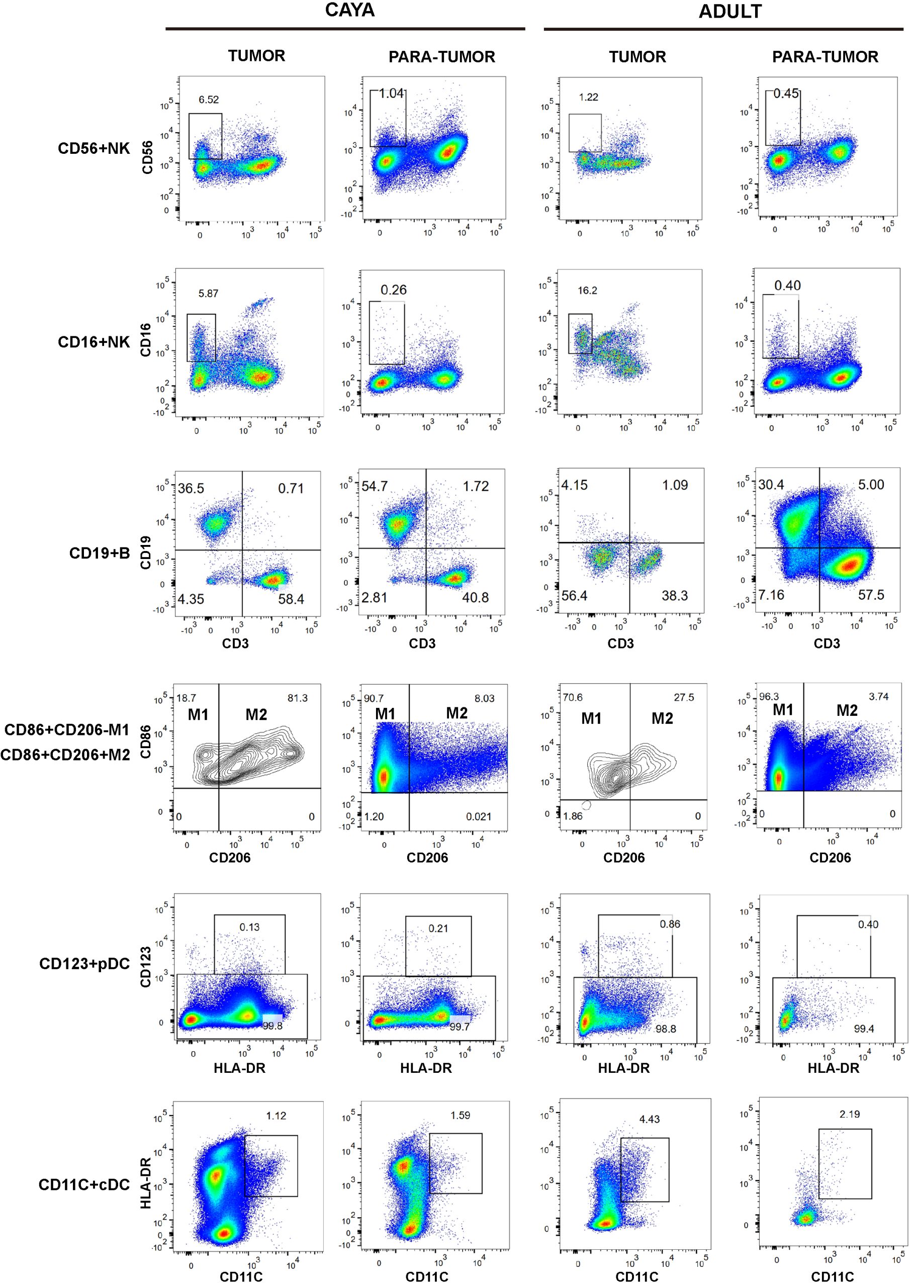To understand the complexity of the tumor ecosystem and dynamic interactions between malignant, stromal, and immune cells in PTC, we designed our study by discovery and validation cohorts. Additional public data including five paired adult samples were integrated in analysis[ ref. advs71040-bib-0006 ] (Table S1, Supporting Information). All tumor samples were collected at diagnosis (Figure advs71040-fig-0001). Whole transcriptome RNA sequencing was also conducted on 50 patients (validation cohort 1; 40 CAYA and 10 adult cases, see Excel S1, Supporting Information), as well as on an additional 550 samples from The Cancer Genome Atlas (TCGA) (validation cohort 2; 493 tumor and 57 normal tissues), to validate the subclustering based on scRNA gene expression and to assess the ecological heterogeneity of PTC. Moreover, multiplexed immunohistochemistry (mxIHC) validation was conducted on 78 paired CAYA and 80 paired adult tissues, each with paired tumor and normal samples (validation cohort 3, see Excel S2, Supporting Information). The contents of T cells, B cells, NK cells, and myeloid cells in tumor tissue and paratumor tissue from 10 CAYA and 10 adults with PTC (validation cohort 4, see Excel S3, Supporting Information) were detected by flow cytometry to confirm differences observed in the discovery cohort (Figure 1B).