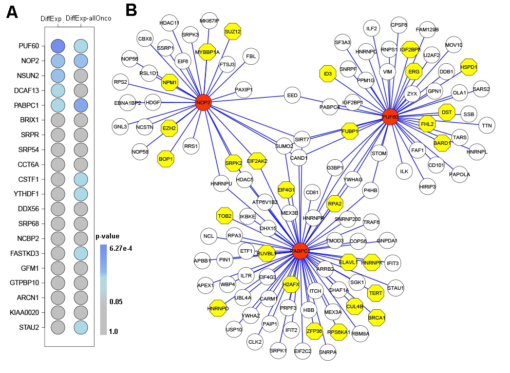- Additional file 1Network of RBP-target interactions in LUAD. (A) Enrichment level of differentially expressed genes and allOnco in the targets of top 20 RBPs with highest fold change in LUAD. (B) PPI network comprising interactions between RBPs and differentially expressed targets in LUAD. The RBPs are those in top 20 and both differentially expressed genes and allOnco enriched in their interaction targets. RBPs are color coded as red, and their target allOnco are color coded as yellow. (TIF)
