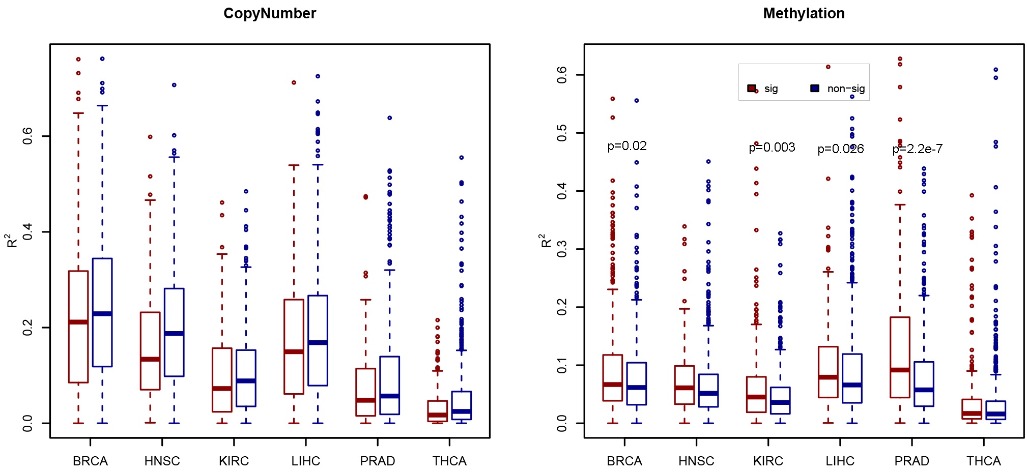 The mRNA-Seq data of 522 matched tumor and adjacent normal samples for 9 cancer types, the copy number alterations, and the DNA methylation data were downloaded from Firehose developed by the Broad GDAC (https://confluence.broadinstitute.org/display/GDAC/Dashboard-Stddata). The nine cancer types are BRCA (Breast cancer carcinoma), COADREAD (colon/ rectum adenocarcinoma), HNSC (head and neck squamous cell carcinoma), LUAD (lung adenocarcinoma), KIRC (kidney renal clear cell carcinoma), LIHC (liver hepatocellular carcinoma), LUSC (lung squamous cell carcinoma), THCA (thyroid carcinoma) and PRAD (prostate adenocarcinoma). There are 111 paired samples for BRCA, 32 for COADREAD, 41 for HNSC, 72 for KIRC, 57 for LUAD, 59 pairs for THCA and 50 for each type of LUSC, LIHC and PRAD, respectively.