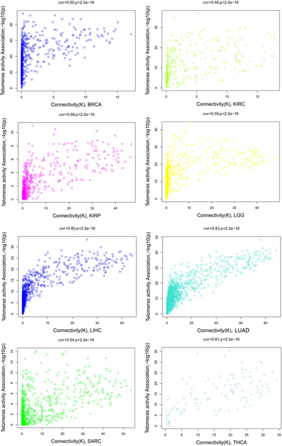 In the gene coexpression module network, hub genes with high intramodular connectivity represent a small proportion of nodes with maximal information compared to other nodes [ref. 23]. Hub genes play important roles in the module network. Ranking the genes in the cell cycle/mitotic nuclear division module according to their connectivity measure (K), we identified several hub genes that are known to be related to telomere maintenance. For instance, one hub gene in KIRP is ASF1B (K = 35.378, ranks within the top 5 among hubs). This gene has recently been revealed to regulate epigenetic modifications at telomeres and interact with telomerase [ref. 34]. This finding implicates a putative connection between the cell cycle/mitotic nuclear division module and telomerase. To explore this further, we next examined the relationship between intramodular connectivity in the cell cycle/mitotic nuclear division module and telomerase activity. Telomerase activity was estimated by expression of a group of genes reported previously [ref. 18]. For each gene in the cell cycle/mitotic nuclear division module, we calculated the Pearson correlation between their expression levels and telomerase activity. The resulting Pearson correlation data show a significantly positive correlation between intramodular connectivity K and telomerase activity across cancer types (Pearson correlation coefficient, R > 0.4, P value < 2.2e-16, Additional file 10: Figure S7). These results indicate that hub genes in the cell cycle/mitotic nuclear division module are associated with telomerase activity.