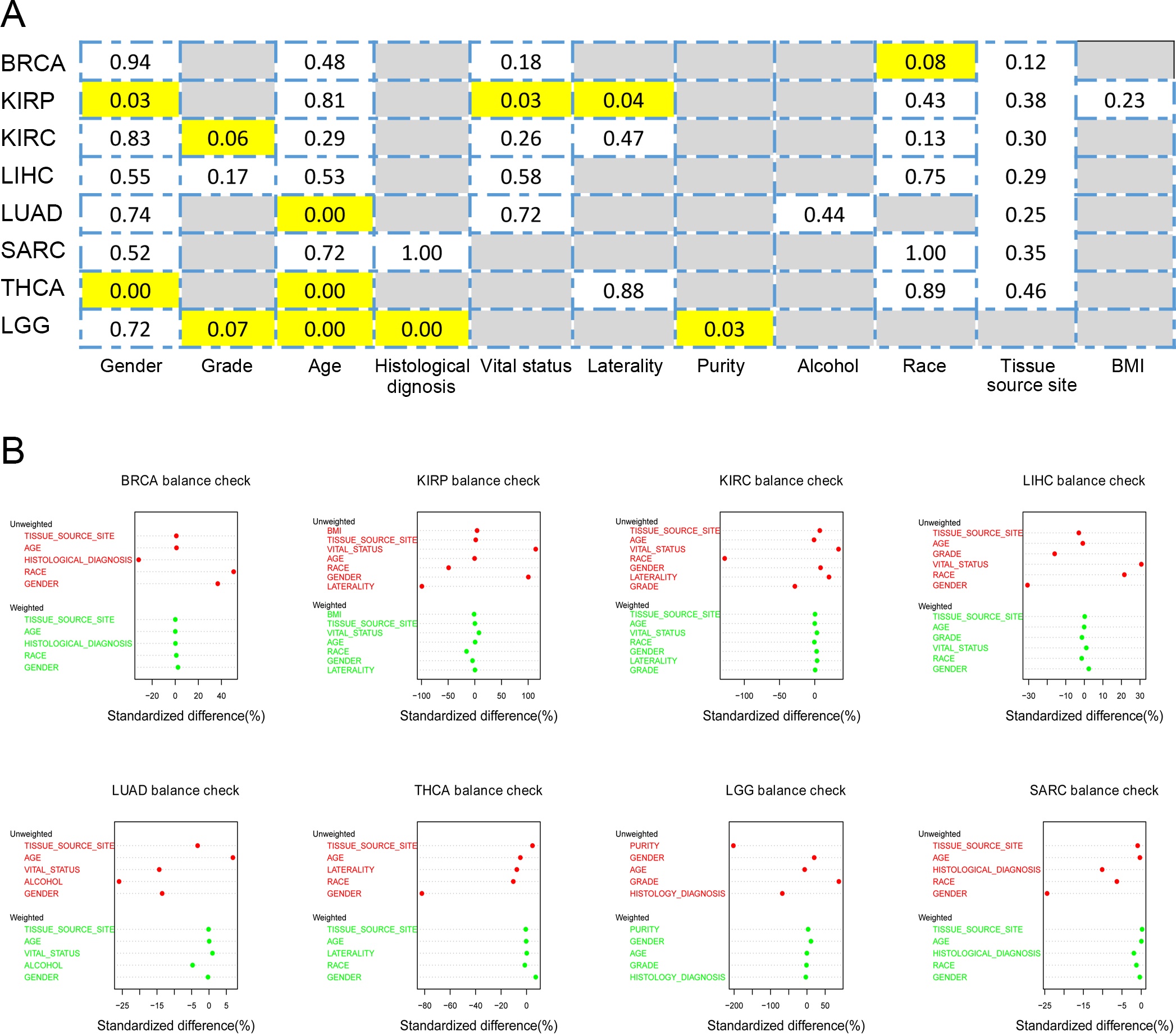 We collected TCGA multi-omics data and clinical characteristics (sex, race, alcohol, laterality, purity and so on) for 8 cancers from the cBioPortal and then applied a propensity score matching (PSM) analysis to identify significant molecular features. Propensity score matching is widely used for studying treatment efforts in observational studies. We used the propensity score method proposed by Liang Li [ref. 22]. Unlike pair matching, this method improves balance and estimates efficiency and uses all subjects by weighting them so that every subject potentially contributes to the estimation.