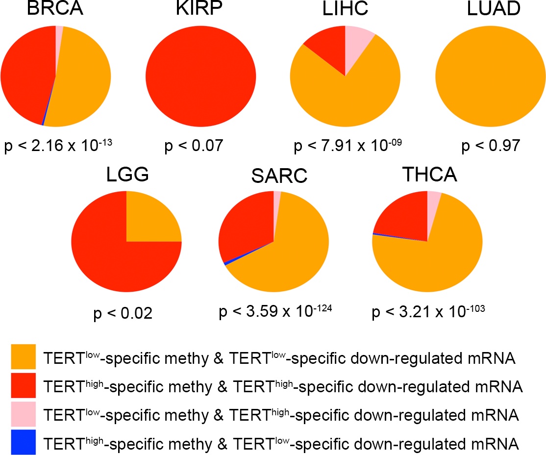 DNA hypermethylation silences gene expression while hypomethylation leads to elevated gene expression levels [ref. 32]. We identified a large number of genes with TERThigh or TERTlow-specific DNA methylation and mRNA expression [FDR < 0.05]. The number of resulting genes ranged from 52 in LGG to 4981 in THCA for DNA methylation and from 102 in KIRP to 5102 in SARC for mRNA expression. When examining the relationship between DNA methylation and mRNA expression, we found that TERThigh or TERTlow-specific DNA methylation was associated with TERThigh or TERTlow-specific downregulated gene expression levels in most cancer types (except for KIRC), suggesting mRNA expression regulation by DNA methylation (Additional file 5: Figure S3).