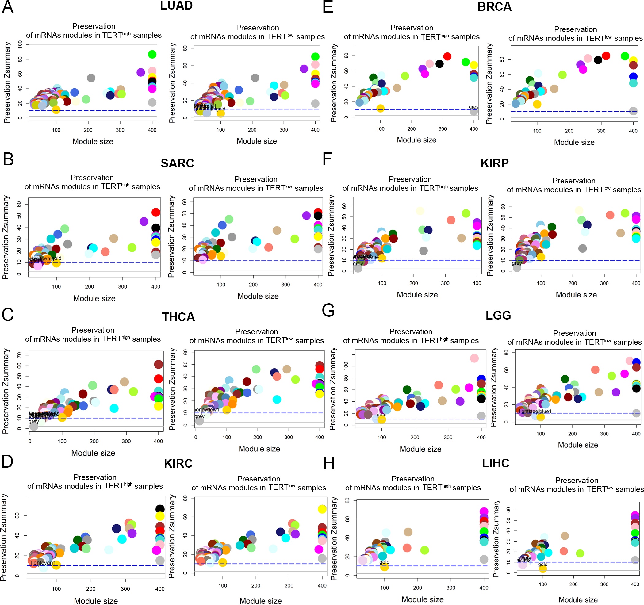 To gain additional system-level understanding of telomerase-associated mRNA expression signatures, we constructed gene coexpression networks using weighted gene coexpression network analysis (WGCNA) for each cancer type. WGCNA identified 38, 63, 76, 70, 52, 101, 47 and 58 coexpression modules in BRCA, KIRC, KIRP, LGG, LIHC, LUAD, SARC and THCA, respectively (Additional file 6: Figure S4). To examine whether the coexpression modules are invariant between TERThigh and TERTlow samples, we constructed networks using either TERThigh or TERTlow samples and performed module preservation test [ref. 33]. The results show that all modules are highly preserved across TERThigh and TERTlow networks with Zsummary > 10 for most modules, supporting the robustness and reproducibility of our identified coexpression modules (Additional file 7: Figure S5). By exploring enriched biological processes for each module by gene ontology analysis, we found four main functional module classes: (A) cell cycle/mitotic nuclear division (P = 1.60E-52 for BRCA, P = 2.59E-56 for KIRC, P = 1.23E-32 for KIRP, P = 1.08E-51 for LIHC, P = 1.69E-31 for LUAD, P = 9.35E-56 for THCA); (B) RNA splicing (P = 3.00E-06 for BRCA, P = 2.11E-07 for KIRC, P = 4.68E-06 for LUAD, P = 0.0002496 for LGG, P = 0.0037 for SARC); (C) extracellular matrix organization (P = 9.85E-39 for BRCA, P = 3.93E-26 for THCA) and (D) angiogenesis/regulation of vasculature development (P = 5.77E-17 for BRCA, P = 8.00E-20 for LIHC). These results further support the observation that TERT-related signatures are associated with cell cycle and RNA processing.