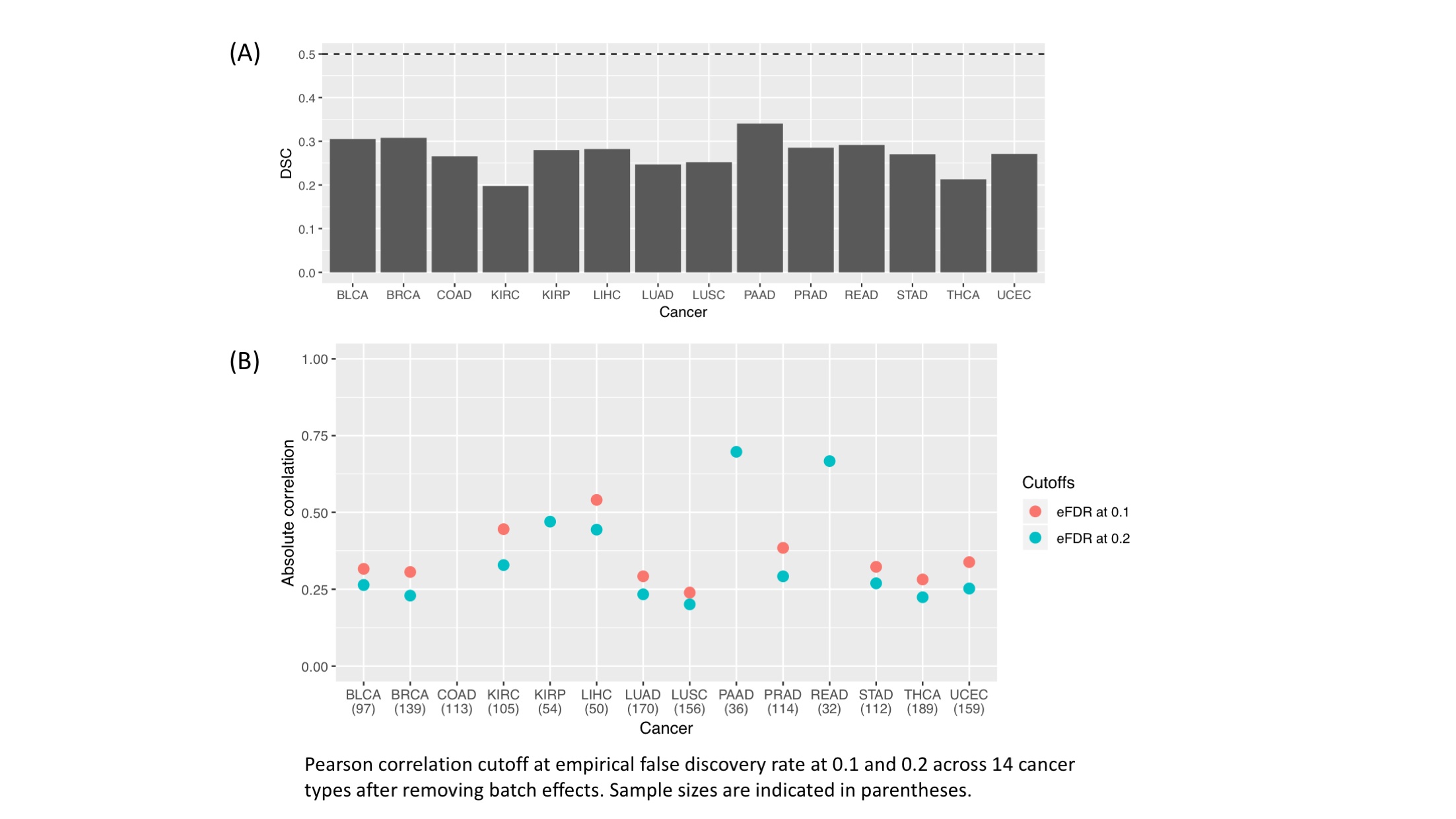 - Significantly correlated isoform-DNA methylation probe pairs were not affected by batch effects in 14 cancer types where batch IDs were available.(A) Dispersion separability criterion (DSC) < 0.5 in each cancer type suggested batch effects were not very strong [42]. (B) Significant correlated isoform-DNA methylation probe pairs were still observed after removing batch effects.(TIFF) (TIFF)