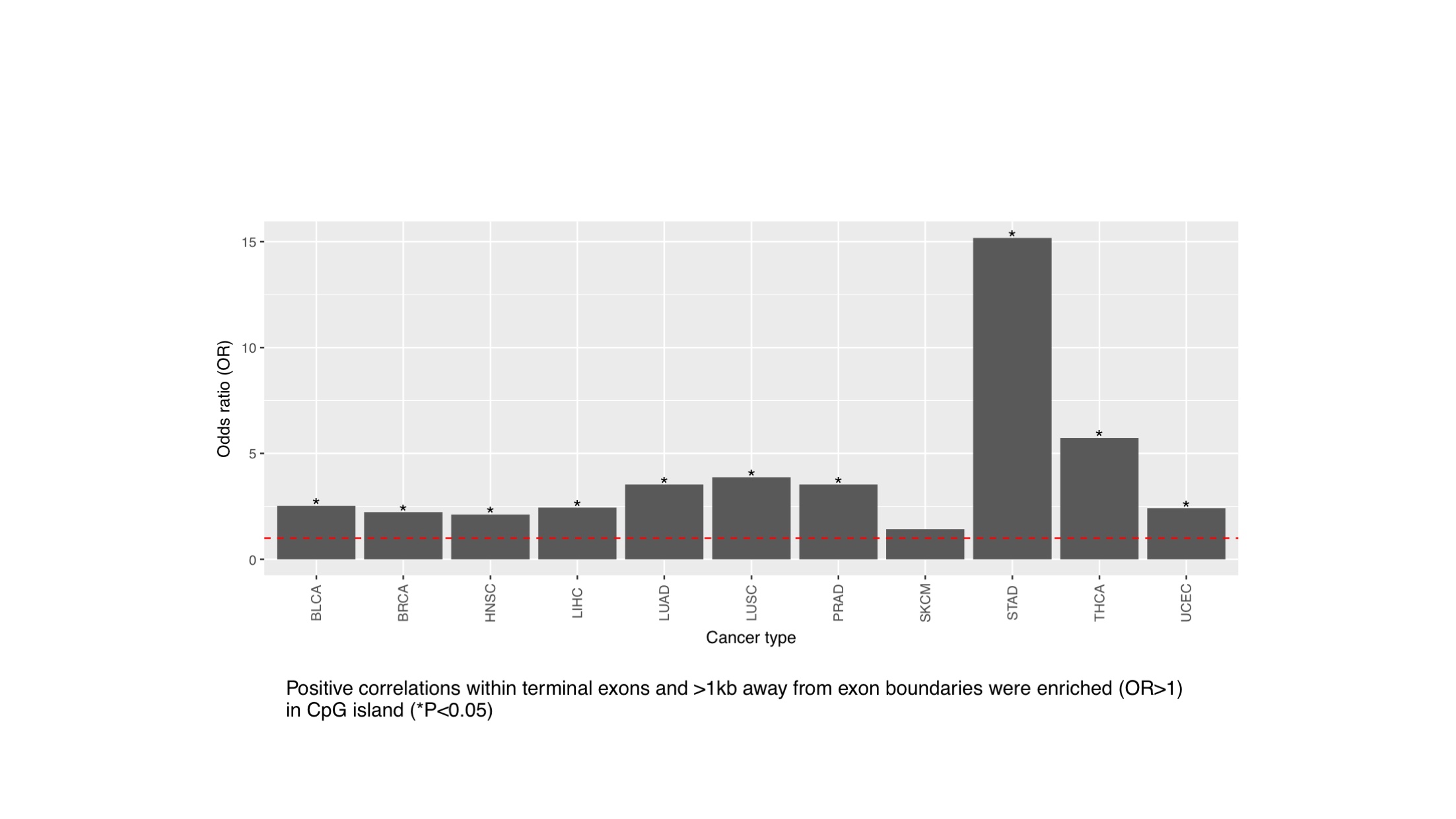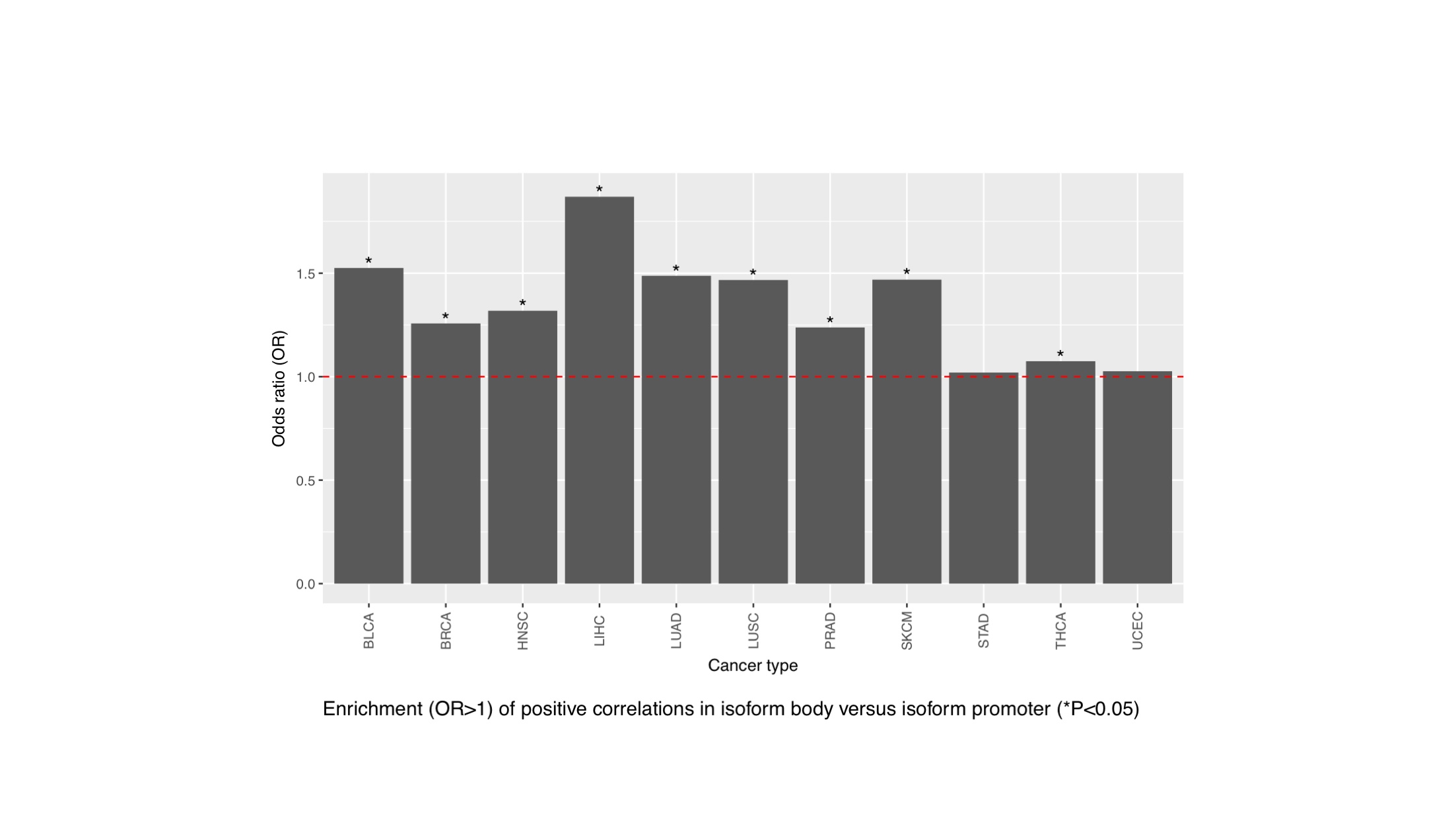 - Positive correlations between DNA methylation and isoform use were enriched in isoform bodies (defined as regions downstream of the first exons) relative to isoform promoters (defined as the first exons and regions upstream of the TSS).The odds were computed between the ratio of positive versus non-positive correlations in isoform bodies and that in isoform promoters for each cancer type.(TIFF) (TIFF)