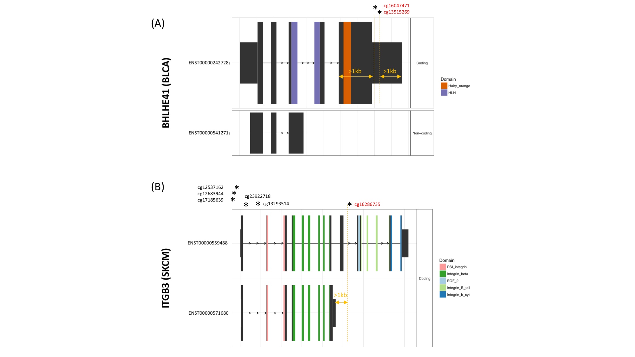 Our findings are illustrated by two (DNAm-correlated) isoform switches we detected in tumor suppressor genes: BLHLE41 (in BLCA) and ITGB3 (in skin cutaneous melanoma, or ‘SKCM’). In both cases, the DNAm corresponded to RNA isoform output (Fig 3C and 3D). For example, the very long terminal exon in BHLHE41 contains two internal methylation sites positively correlated with the inclusion of a long terminal exon but negatively correlated with the shorter isoform (Fig 3C). The shorter isoform is noncoding and lacks the helix-loop-helix and ‘hairy_orange’ domains, known for DNA binding and interaction with repressive chromatin modifying enzymes (S6A Fig). Similarly, in ITGB3, methylation of a site located >1 kb beyond the terminal exon of the shorter isoform positively correlates with use of the longer isoform and alternative TTS but negatively correlates with the shorter isoform (Fig 3D). Here, both isoforms produce coding transcripts, but the shorter one lacks EGF_2 domains and integrin tail and cytoplasmic domains, necessary for activation of Src tyrosine kinase signaling used in cell movement and proliferation (S6B Fig). Of note, we identified DNAm at five sites near the TSSs also positively correlated with the longer isoform, but negatively correlated with the shorter one, suggestive of additional epigenetic relationships in isoform regulation.