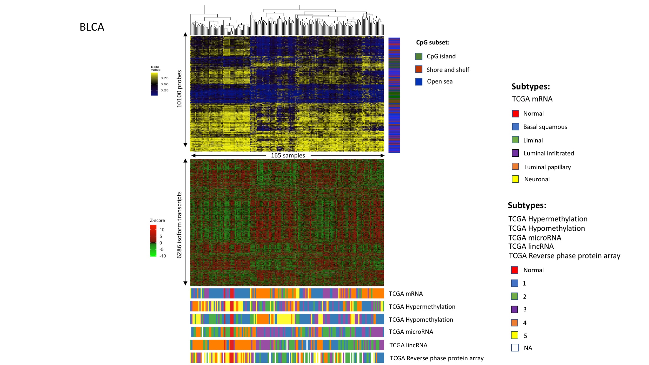 - Link between DNAm patterns, isoform usage patterns, and previously identified subtypes in bladder cancer (BLCA).Figures were plotted in the same way as Fig 4A and 4B. Samples were clustered based on DNAm levels of isoform-correlated probes.(TIFF) (TIFF)