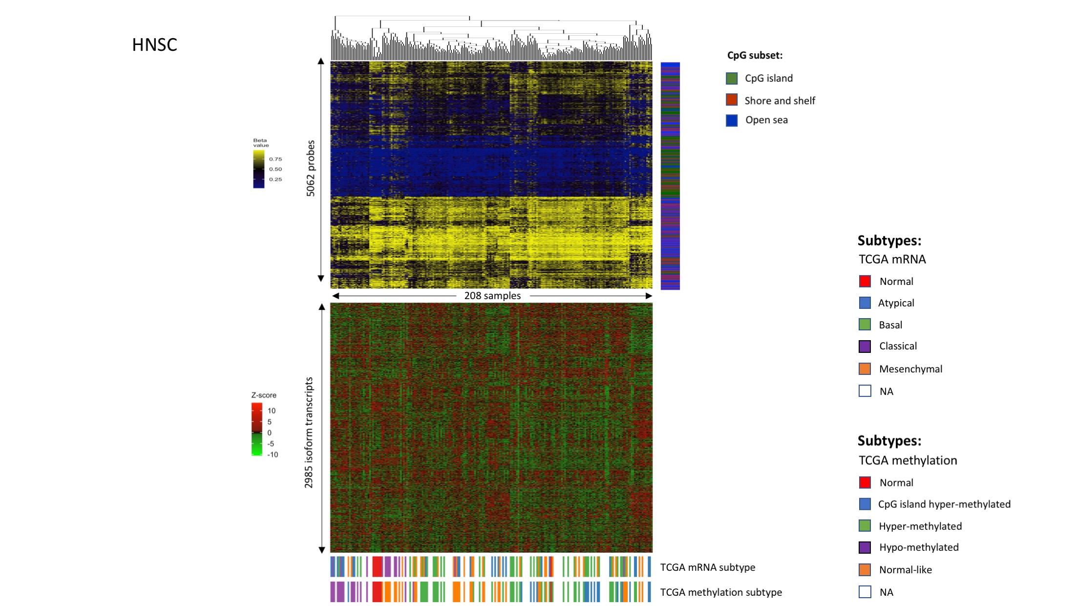 - Link between DNAm patterns, isoform usage patterns, and previously identified subtypes in head and neck cancer (HNSC).Figures were plotted in the same way as Fig 4A and 4B. Samples were clustered based on DNAm levels of isoform-correlated probes.(TIFF) (TIFF)