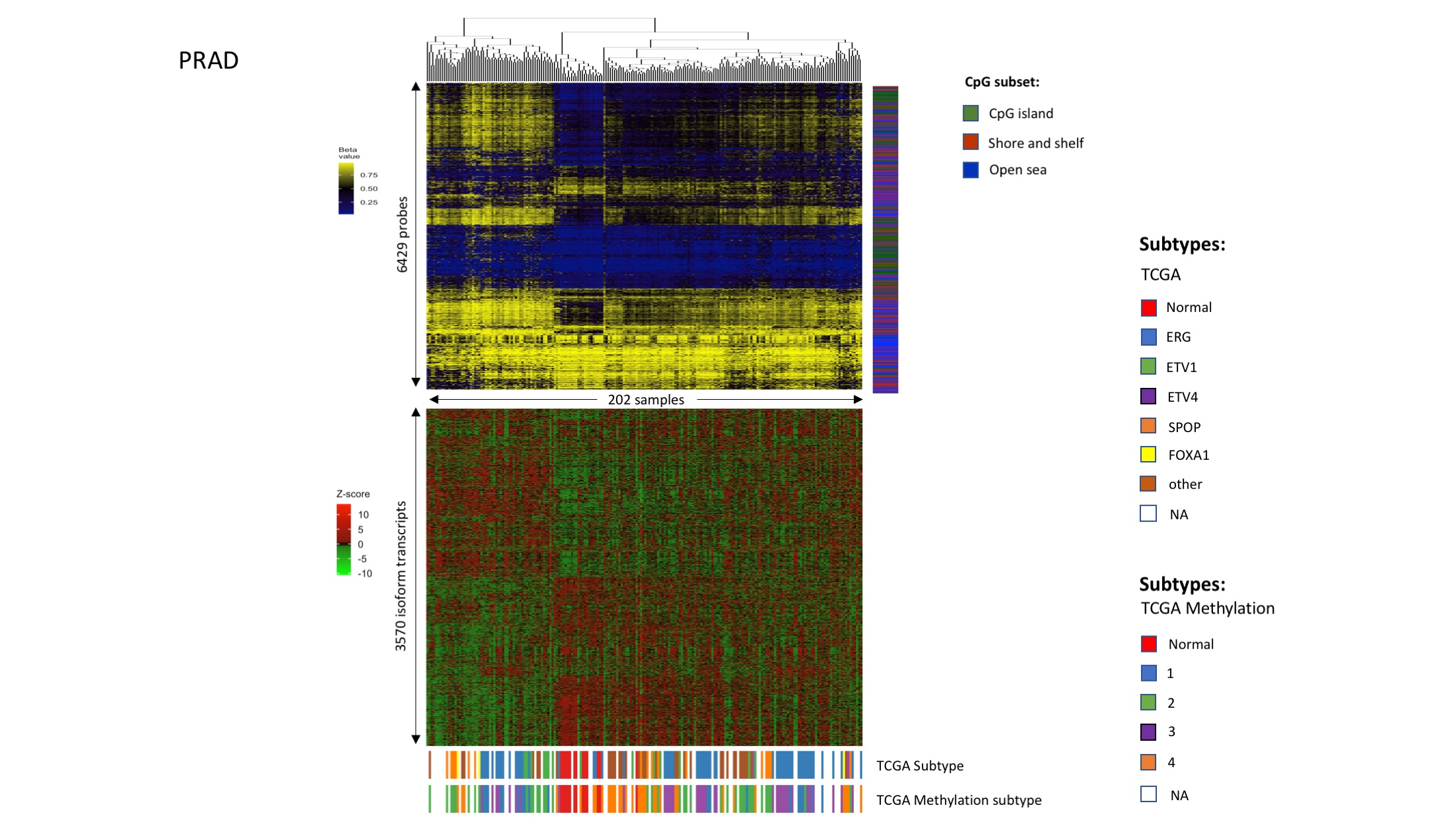 - Link between DNAm patterns, isoform usage patterns, and previously identified subtypes in prostate cancer (PRAD).Figures were plotted in the same way as Fig 4A and 4B. Samples were clustered based on DNAm levels of isoform-correlated probes.(TIFF) (TIFF)