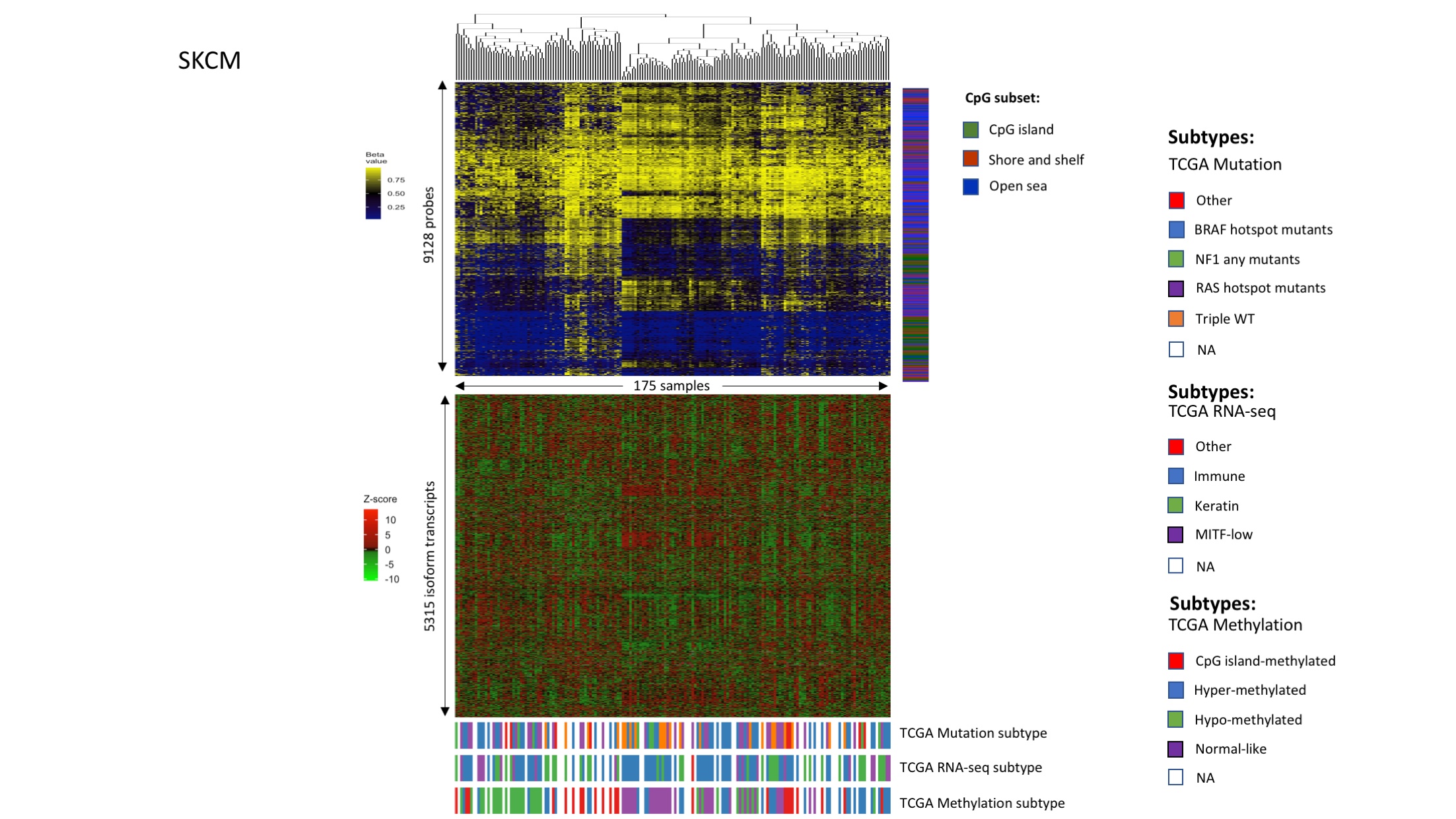 - Link between DNAm patterns, isoform usage patterns, and previously identified subtypes in melanoma (SKCM).Figures were plotted in the same way as Fig 4A and 4B. Samples were clustered based on DNAm levels of isoform-correlated probes.(TIFF) (TIFF)