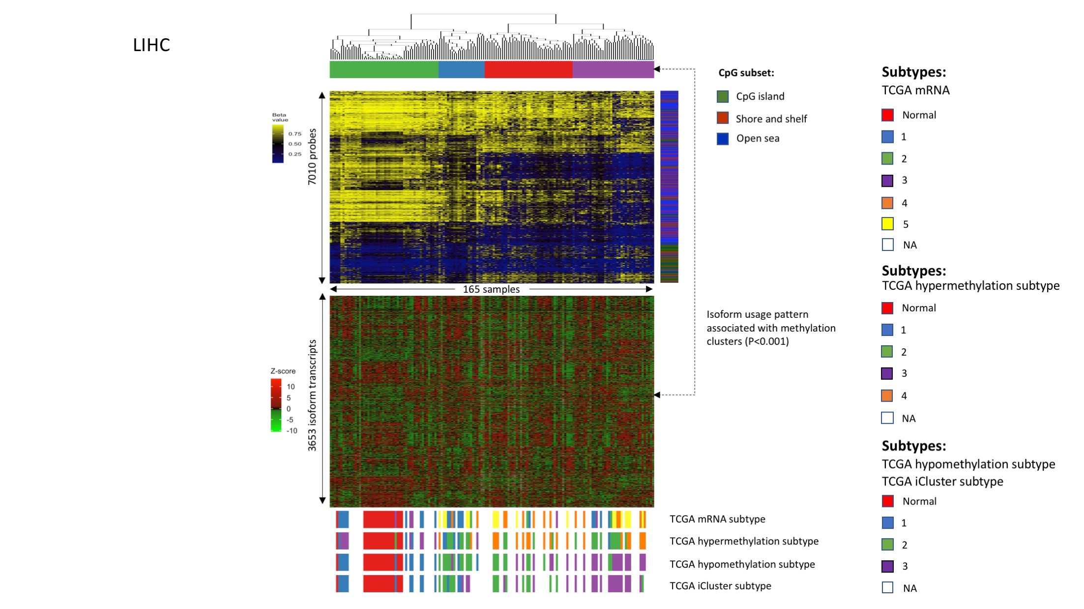 - Link between DNAm patterns, isoform usage patterns, and previously identified subtypes in liver cancer (LIHC).Figures were plotted in the same way as Fig 4A and 4B. Samples were clustered based on DNAm levels of isoform-correlated probes.(TIFF) (TIFF)