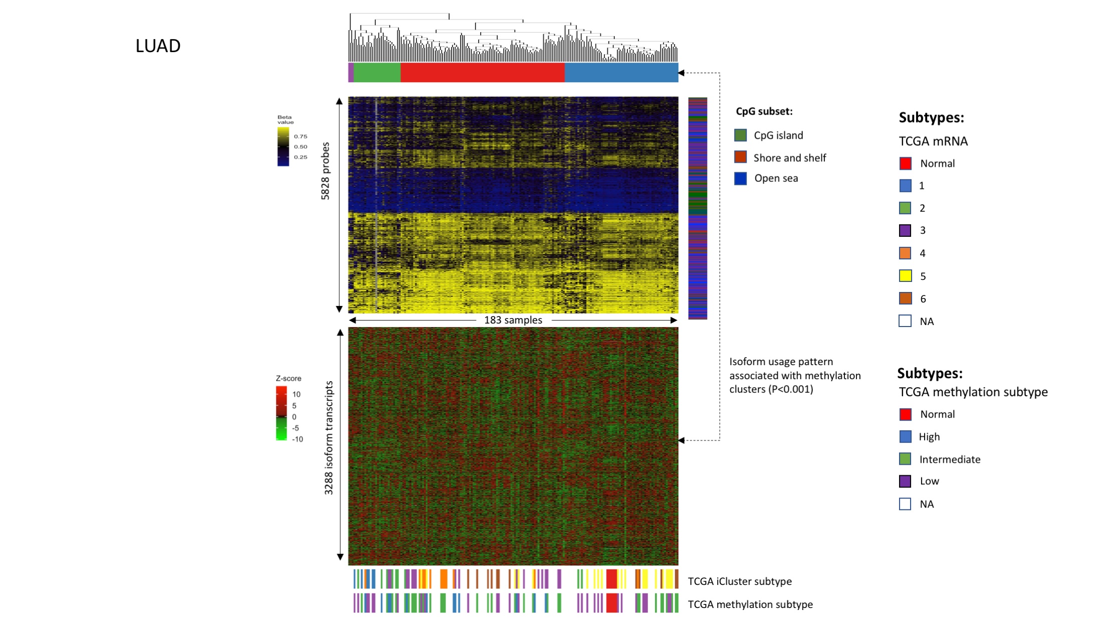 - Link between DNAm patterns, isoform usage patterns, and previously identified subtypes in lung adenocarcinoma (LUAD).Figures were plotted in the same way as Fig 4A and 4B. Samples were clustered based on DNAm levels of isoform-correlated probes.(TIFF) (TIFF)