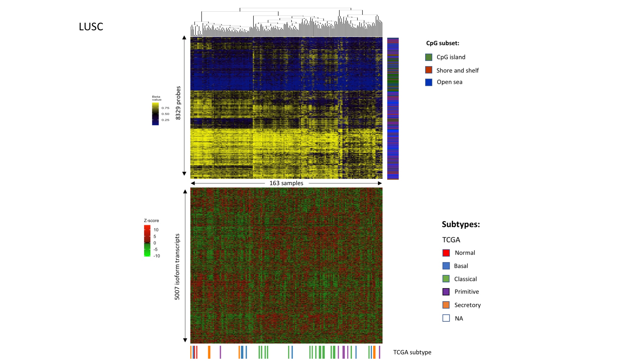 - Link between DNAm patterns, isoform usage patterns, and previously identified subtypes in lung squamous cell carcinoma (LUSC).Figures were plotted in the same way as Fig 4A and 4B. Samples were clustered based on DNAm levels of isoform-correlated probes.(TIFF) (TIFF)