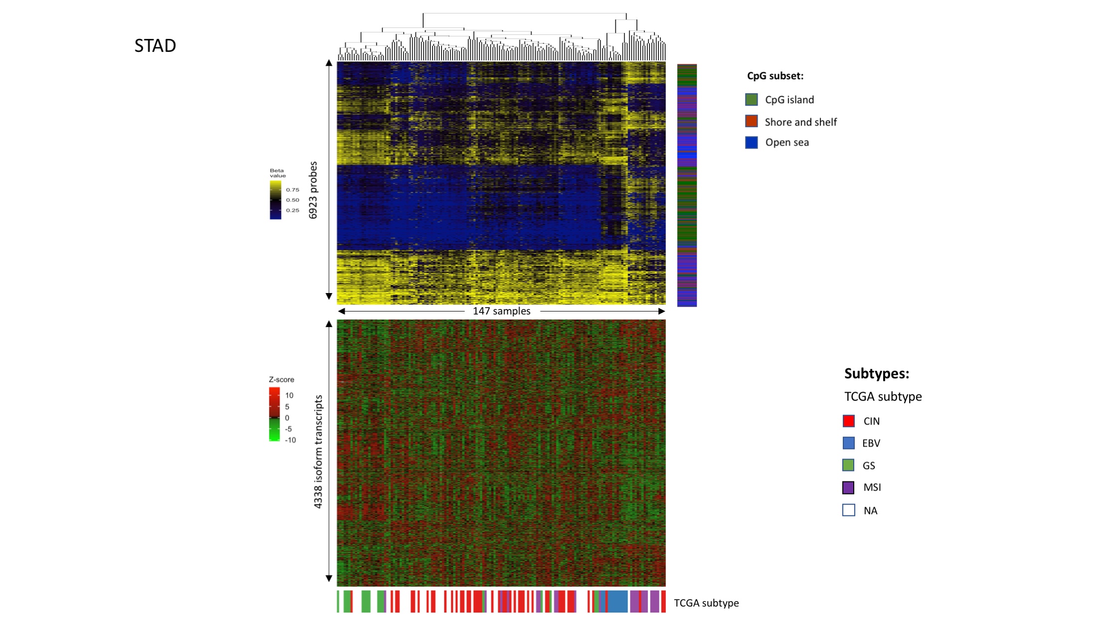 - Link between DNAm patterns, isoform usage patterns, and previously identified subtypes in stomach cancer (STAD).Figures were plotted in the same way as Fig 4A and 4B. Samples were clustered based on DNAm levels of isoform-correlated probes.(TIFF) (TIFF)