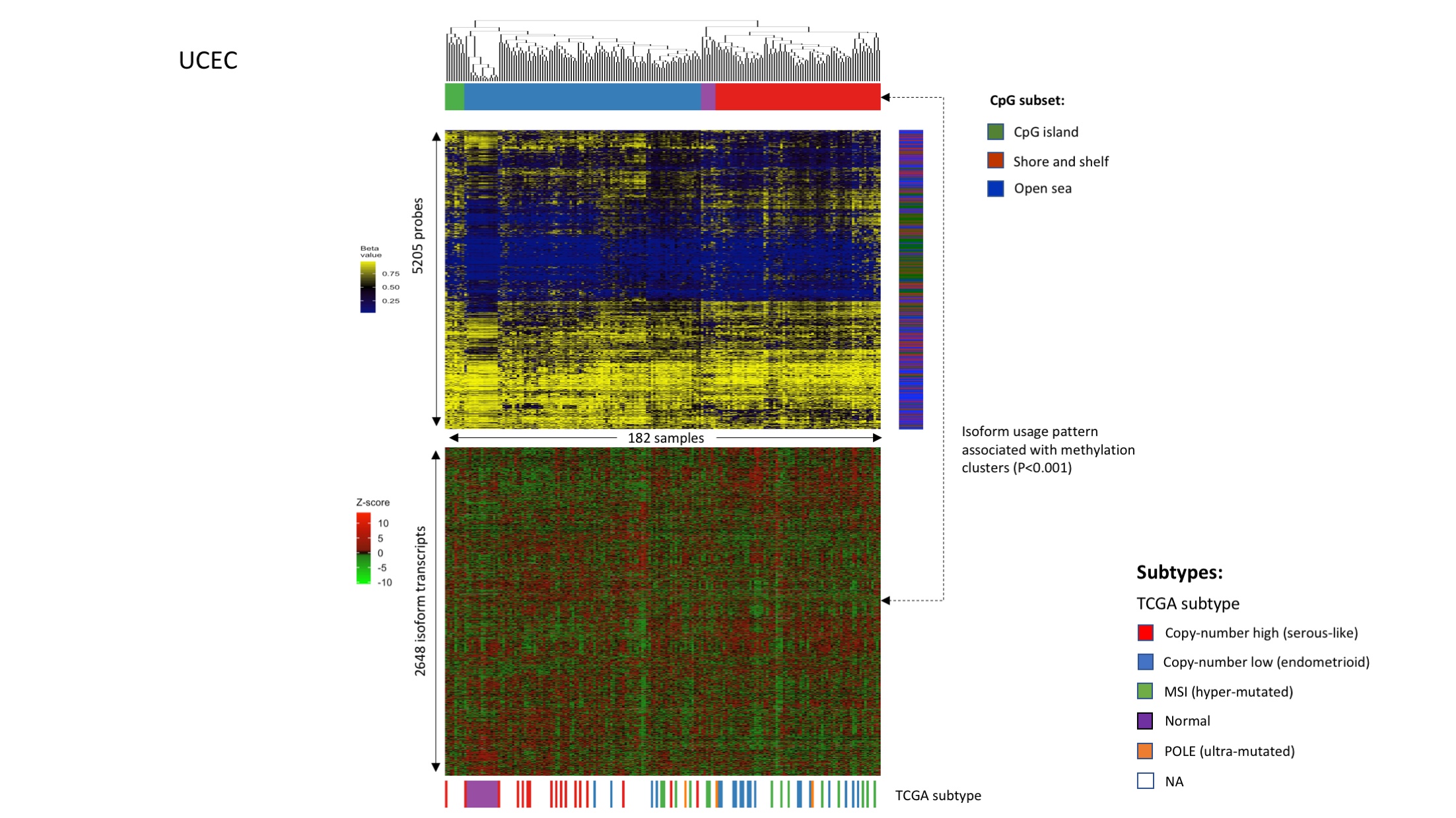 - Link between DNAm patterns, isoform usage patterns, and previously identified subtypes in uterine corpus endometrial carcinoma (UCEC).Figures were plotted in the same way as Fig 4A and 4B. Samples were clustered based on DNAm levels of isoform-correlated probes.(TIFF) (TIFF)
