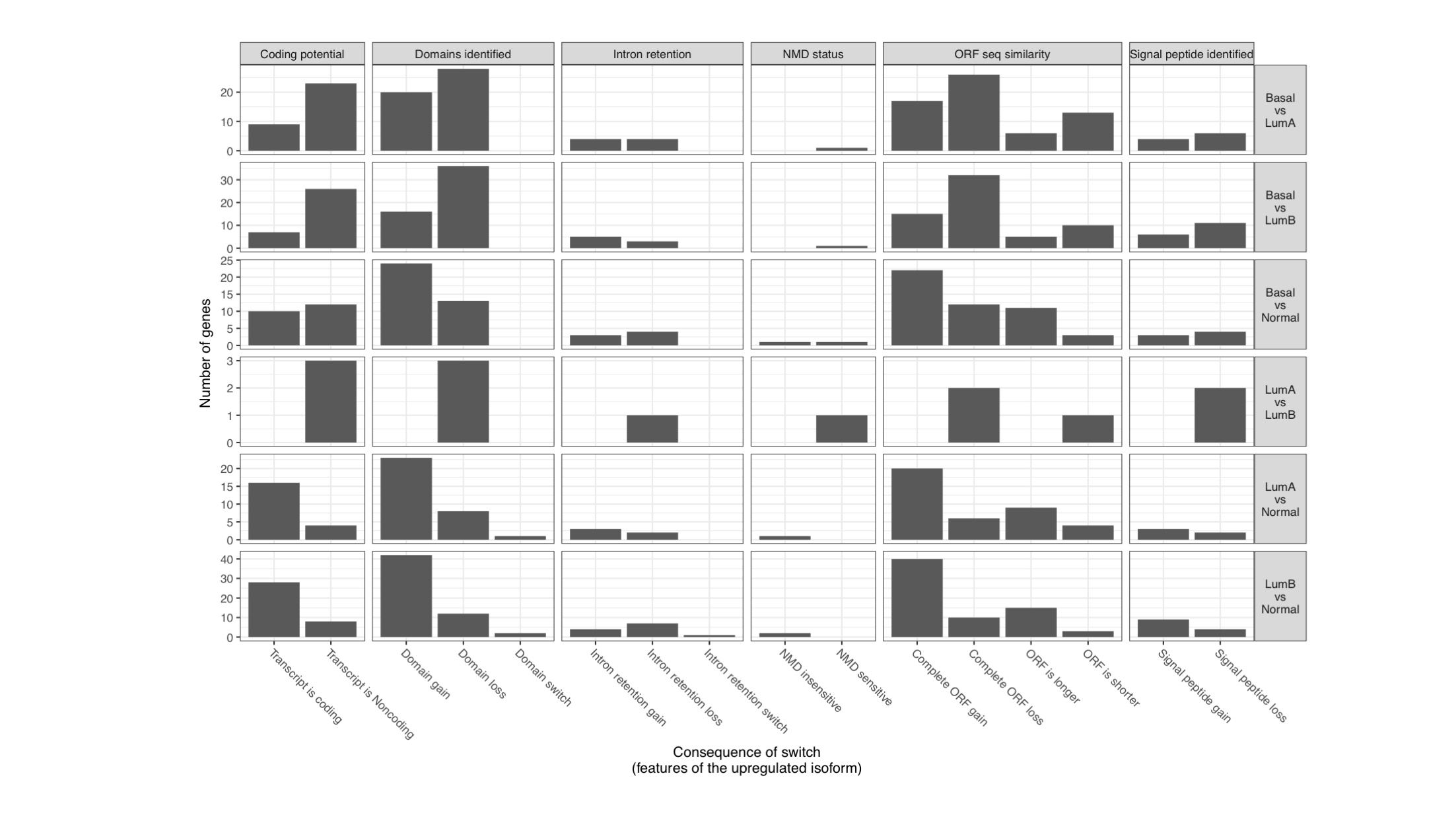 - Number of genes predicted to be functionally affected by DNAm-correlated isoform switching among breast cancer subtypes and normal samples.Each bar represents the number of genes affected by a particular type of functional change due to DNAm-correlated isoform switching from subtype A to subtype B, as predicted by IsoformSwitchAnalyzeR [4].(TIFF) (TIFF)