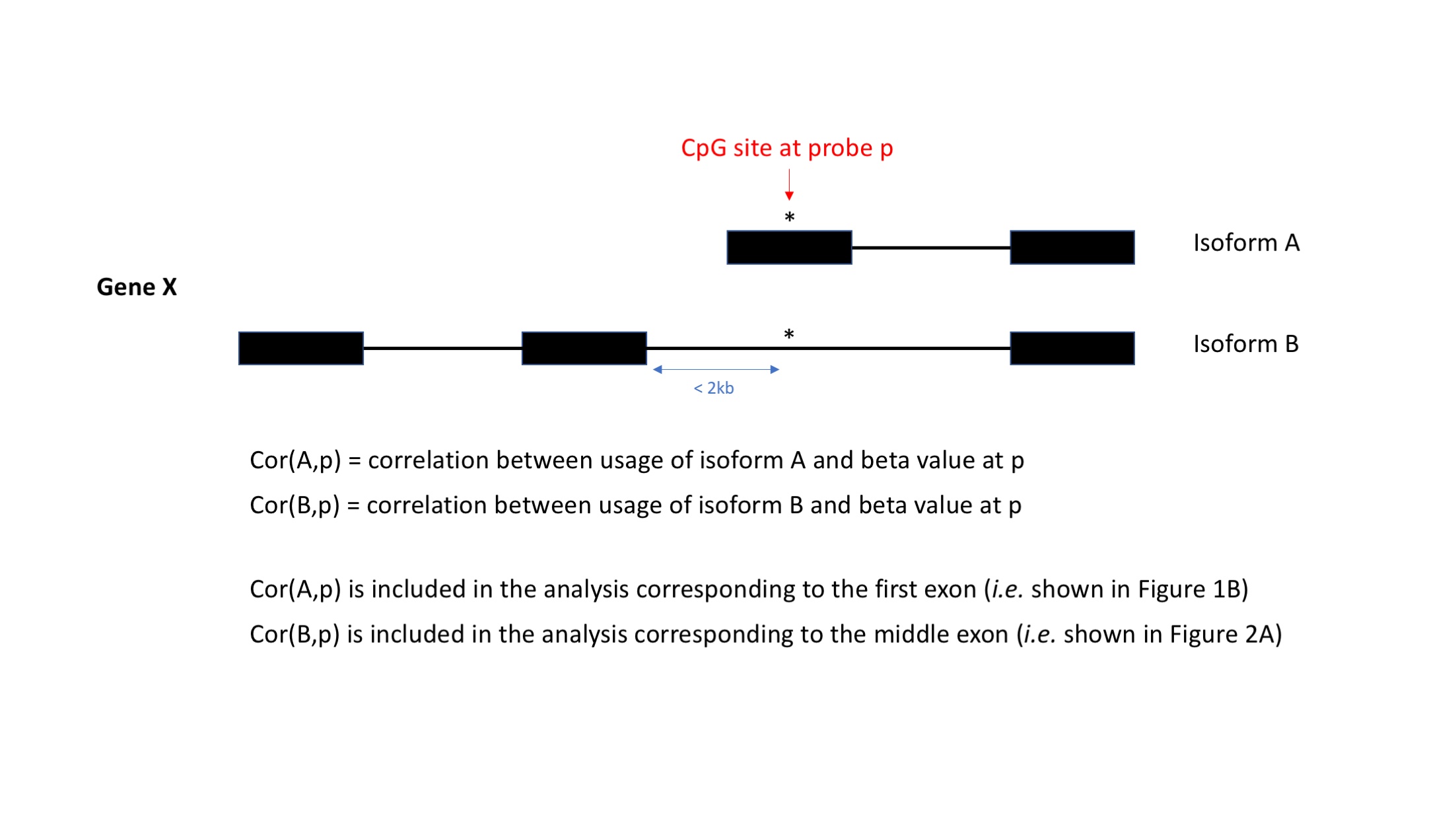 Each analysis only included relevant isoform-probe pairs depending on the probe site location in the exon-intron structure of the paired isoform. For example, the analysis for DNAm-isoform correlation around the first exon only considered isoform-probe pairs whose probes were located in or around the first exon of the paired isoforms. Thus, a probe paired with multiple isoforms could be counted multiple times in one or more analyses. For example, using this approach, a probe p could be located in the first exon of isoform A but in the second intron of isoform B in two distinct isoform-probe pairs (A–p and B–p). When we analyzed probes inside or around the first exon, the pair A–p would be included in the analysis, but the pair B–p would not (S17 Fig).
