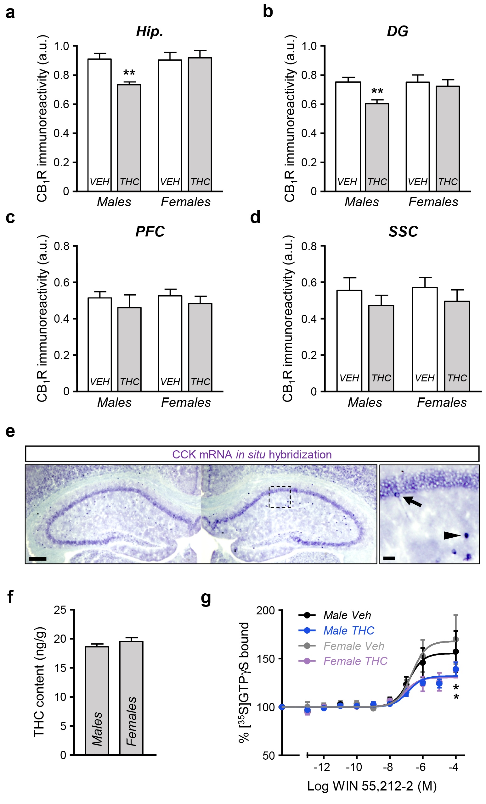 Next, we evaluated whether these alterations are due to a previously described morphogenetic role of CB1R in developing interneurons [ref. 23] or to a decrease in the total number of CCK+ interneurons. To address this question, we performed ISH with a riboprobe against CCK, combined with anti-GABA IHC to unequivocally identify CCK-containing hippocampal interneurons, given the broad expression of CCK by CA1 pyramidal neurons (Fig. 1e and Supplementary Fig. S1e). Stereological analysis showed a selective reduction of CA1 CCK+ interneuron density in THC-treated males as compared either with vehicle-treated males or with females irrespective of the treatment (Fig. 1f). Taken together, these findings support that those mice that had been exposed to THC during embryonic development exhibit an overt interneuronopathy with a remarkable sexual dimorphism. To rule out the possibility that sexual differences emerge from pharmacokinetic factors, such as THC bioavailability, we measured THC levels in E17.5-brain tissue (i.e., 12 h after the last THC injection) and found similar values in both sexes (Supplementary Fig. S1f). In addition, as protracted embryonic THC exposure leads to a transient downregulation of CB1R [ref. 16], we asked whether a sex-dependent CB1R downregulation might be responsible for the observed effects. [35S]GTPƳS-binding analysis in E17.5-brain tissue revealed an evident downregulation of CB1R after embryonic THC exposure, but comparable curves were obtained for both sexes (Supplementary Fig. S1g).