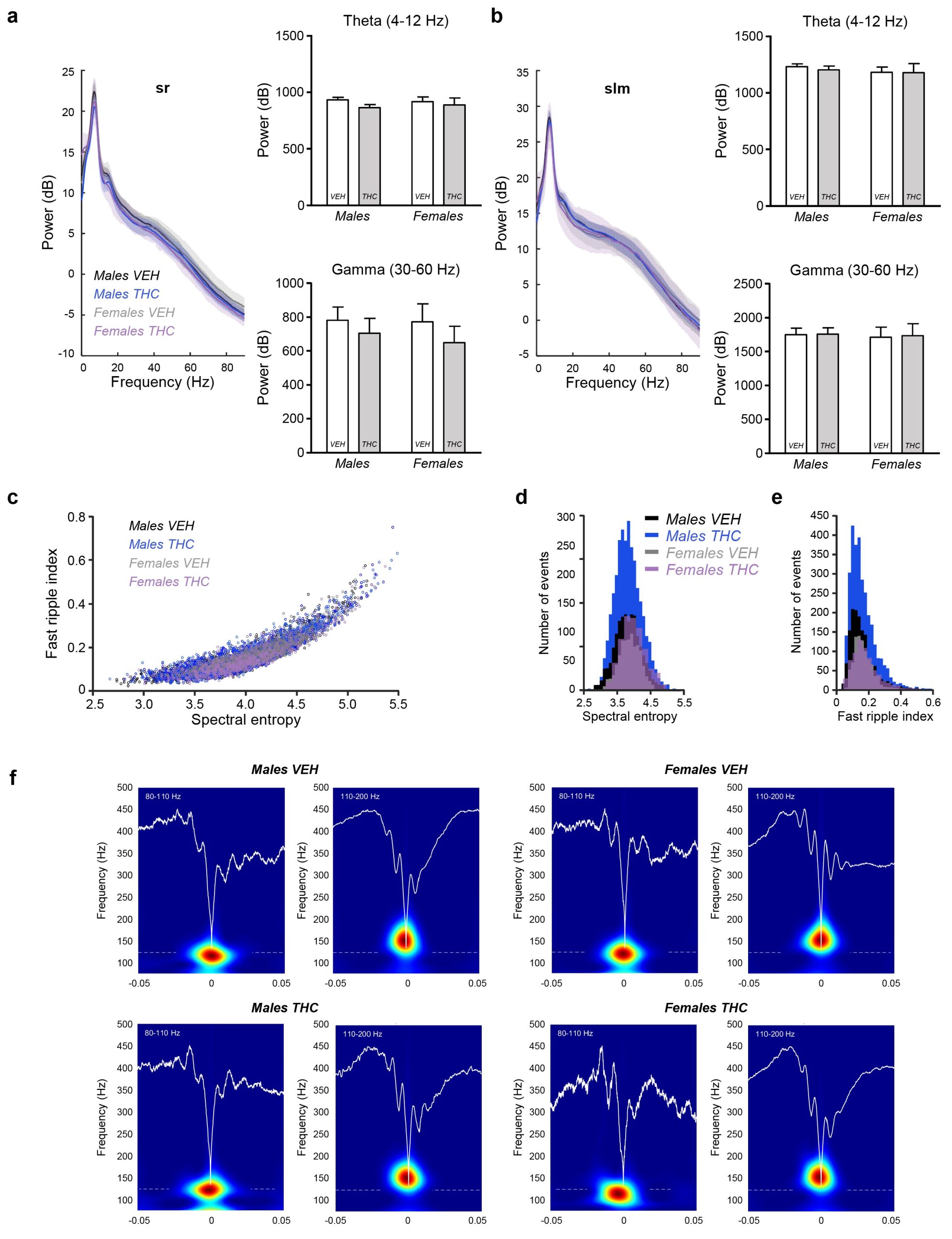 CCK+ BCs are essential for proper hippocampal physiology and function [ref. 24–ref. 26]. Hence, we decided to further characterize the aforementioned THC-induced deficits via intrahippocampal recordings. Specifically, we performed in vivo electrophysiological recordings of the LFP throughout CA1 in the hippocampus of head-fixed P60 adult mice (Fig. 2a). During running, θ (4–12 Hz) and γ oscillations (30–60 Hz) typical of exploratory behavior were recorded across layers (Fig. 2b). Spectral analyses of the LFP signal revealed changes in the θ band that were confined to the sp of CA1 (Fig. 2c, d and Supplementary Fig. S2a, b). THC treatment tended to reduce the γ power at sp consistently in both males and females (Fig. 2e). These data align with the idea of a complementary role of CCK BCs in hippocampal θ and γ oscillations [ref. 25], and the impact of THC administration in network oscillations and psychiatric traits [ref. 27].