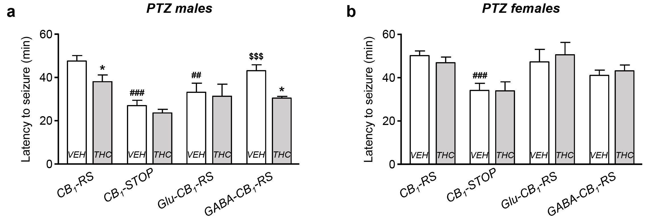 Here we demonstrate that conditional CB1R ablation in the interneuron lineage induces a similar sex-dependent interneuronopathy and spatial memory impairment as that evoked by prenatal THC treatment, thus pointing to CB1R receptor loss of function as the main mechanism of THC action on the analyzed traits. Overall, repeated cannabinoid exposure in the immature brain results in functional antagonism of CB1R signaling in principal neurons [ref. 16] and CCK BCs (present study). As a consequence of THC treatment, CB1R desensitizes and the resulting cannabinoid signaling impairment would favor the development of seizures and spatial cognitive deficits in a sex-dimorphic manner. In agreement, post-hoc sex-dependent analyses of PTZ-induced seizure susceptibility in mice conditionally CB1R-rescued from a CB1R-null background and subjected to prenatal THC treatment [ref. 16] confirms the involvement of GABAergic interneurons, but not principal neurons, in the THC-induced hyperexcitability of the male progeny (Supplementary Fig. S4). Recently, some consequences of prenatal THC exposure in the male offspring have been shown to be rescued by co-administration of pregnenolone, a CB1R modulator [ref. 13]. In summary, the study of functional consequences (hyperexcitability, cognition, and other behavioral traits), in vivo electrophysiological recordings, and neuron-lineage tracking in conditional CB1R-deficient mice, as shown herein, demonstrates that neurodevelopmental exposure to THC exerts a sex-dependent interneuronopathy that selectively affects spatial cognitive function in male offspring.