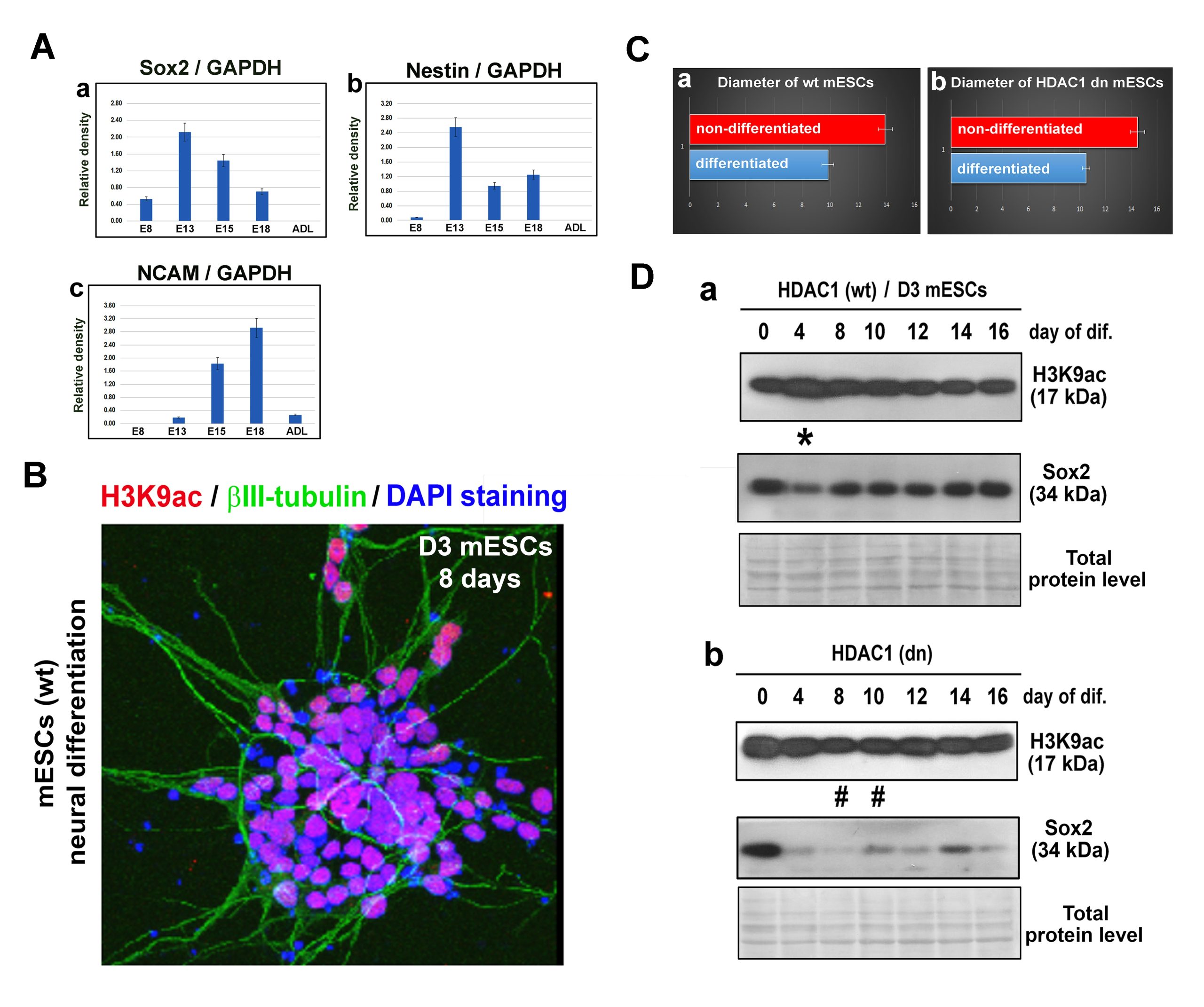 To perform the Western blot analyses and immunofluorescence experiments, we cultured D3 wild type (wt) mouse embryonic stem cells and HDAC1 (dn) mESCs as previously described (ref. Lagger et al., 2002; ref. Zupkovitz et al., 2010). The cells were cultured in DMEM (Gibco, Grand Island, NY) culture medium containing 15% fetal bovine serum, 0.1 mM non-essential amino acids, 100 µM MTG, 1 ng/ml LIF, 10,000 IU/ml penicillin, and 10,000 µg/ml streptomycin. The culture dishes were coated with Matrigel (#354277, Corning, Bedford, MA) according to the manufacturer’s instructions see also (ref. Franek et al., 2015). The ES cells were seeded at 5,000 cells per cm2 in culture dishes. To induce differentiation, the mESCs were cultured without LIF. After 2 days, the culture medium was replaced with serum-free commercial medium DMEM/F-12 (1:1) (Gibco) supplemented with insulin, transferrin, and selenium (ITS-100x, Gibco), 1 μg/ml fibronectin according to (ref. Pachernik, Esner, Bryja, Dvorak, & Hampl, 2002) (Sigma–Aldrich, Czech Republic), and a penicillin/streptomycin mixture. Neural differentiation was induced by adding 0.5 μM all-trans retinoic acid to the medium on the 3–4th day of differentiation (Sigma–Aldrich). On the 4th day of differentiation, the cells were washed three times with PBS, and the medium was changed every second day until days 8–16.