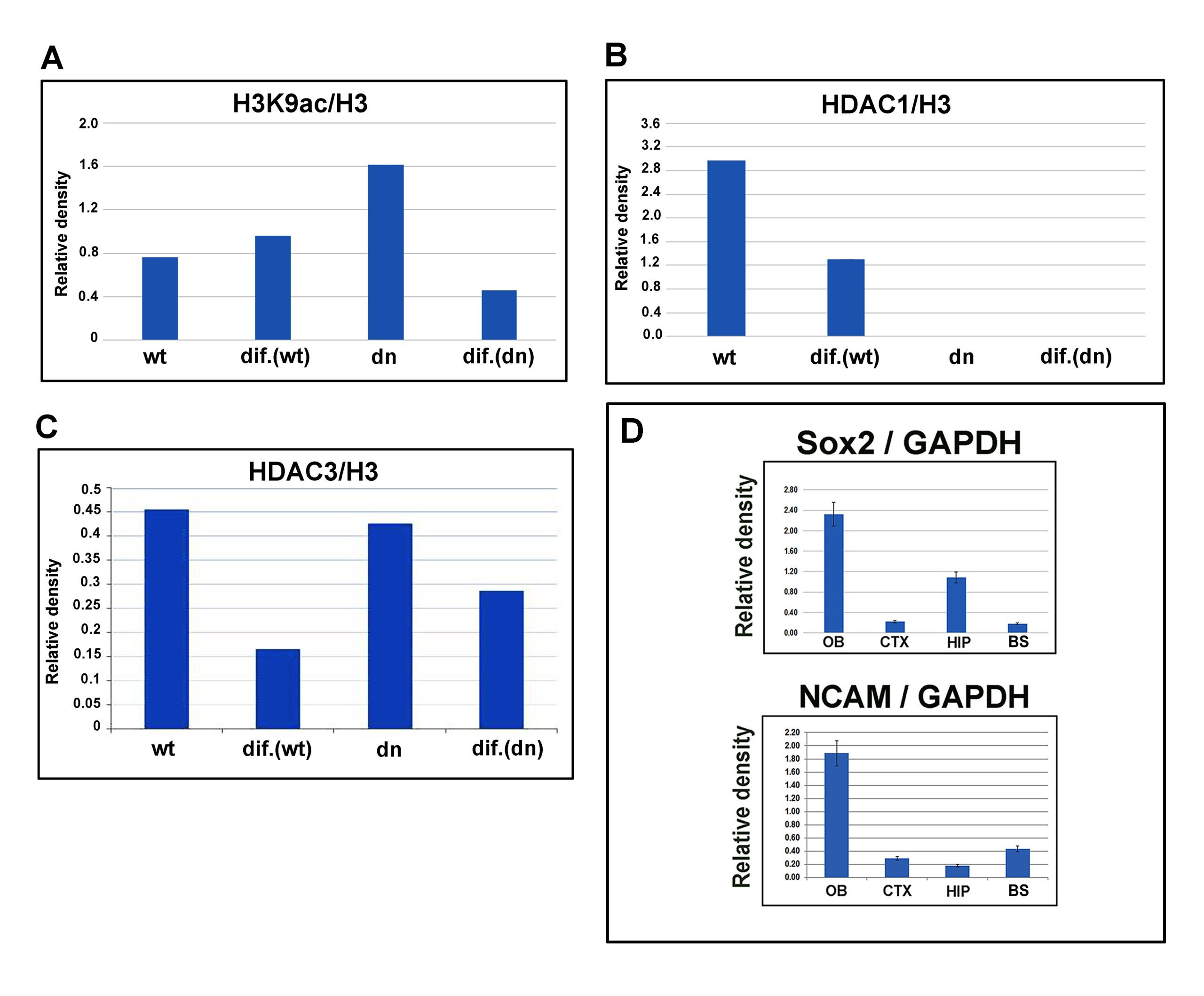 In addition, we used ChIP-PCR to study the levels of H3K9ac and H4ac associated with the promoter and exon of the Sox2 gene. In the promoter of Sox2, we observed a decrease in H3K9ac and H4ac in both differentiated HDAC1 (wt) and HDAC1 (dn) mESCs. This observation correlated with a pronounced decrease in the level of the Sox2 protein during the differentiation events (Figure 5a,b,b1,b3). On the other hand, in the Sox2 exon, although the H4 acetylation was systematically depleted in both differentiated (wt) and HDAC1 (dn) mESCs, H3K9ac was not depleted in the differentiated (wt) cells (Figure 5b,b2,b4). Thus, these experiments showed that H4ac, rather than H3K9ac, drives the Sox2 regulation during the differentiation processes, including neuro-differentiation and astrogliogenesis.