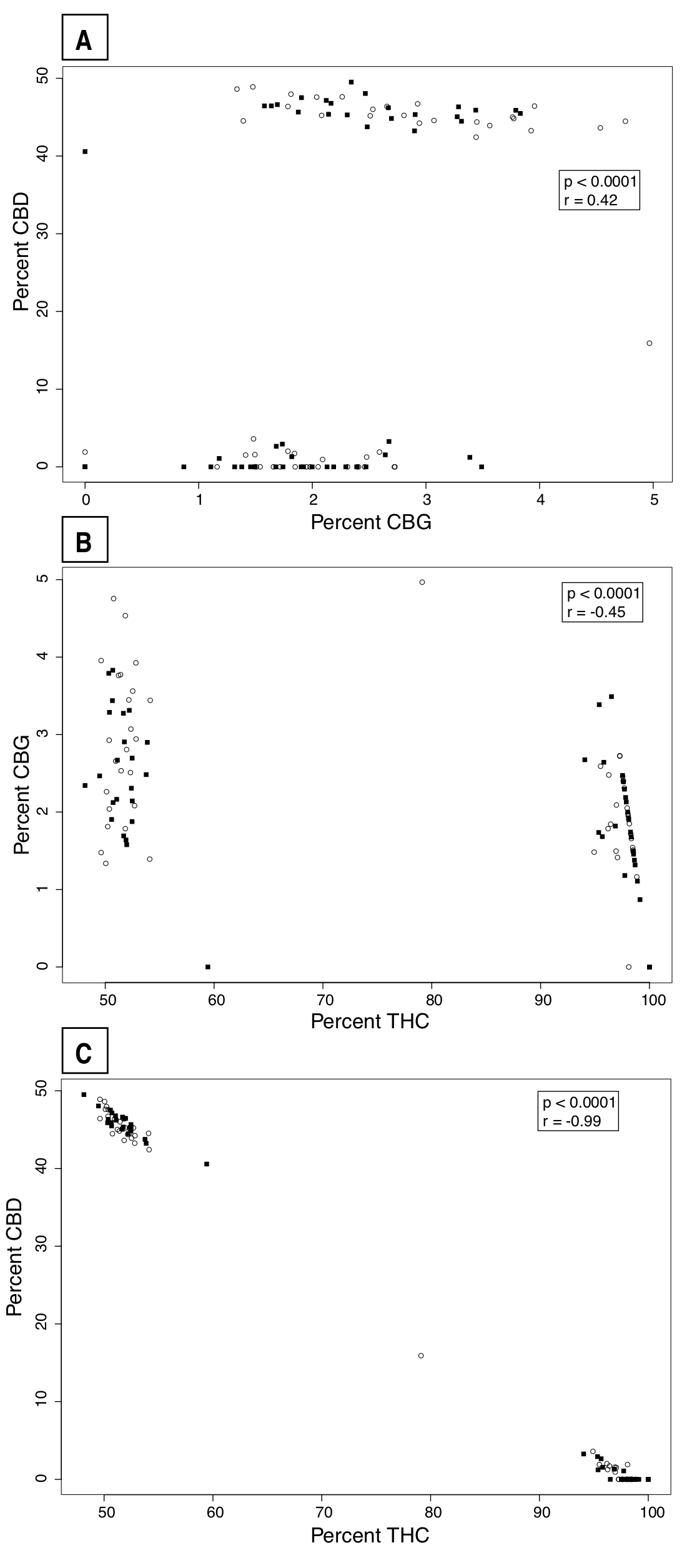- Relationships between percent THC, CBD, and CBG.A and B show a positive correlation between CBG vs CBD, and THC vs CBG, respectively. C displays the negative linear relationship between THC and CBD. Notice the differences in the axis representing the disparity in production of the different cannabinoids. Males are shown in squares, females in open circles. (PNG)