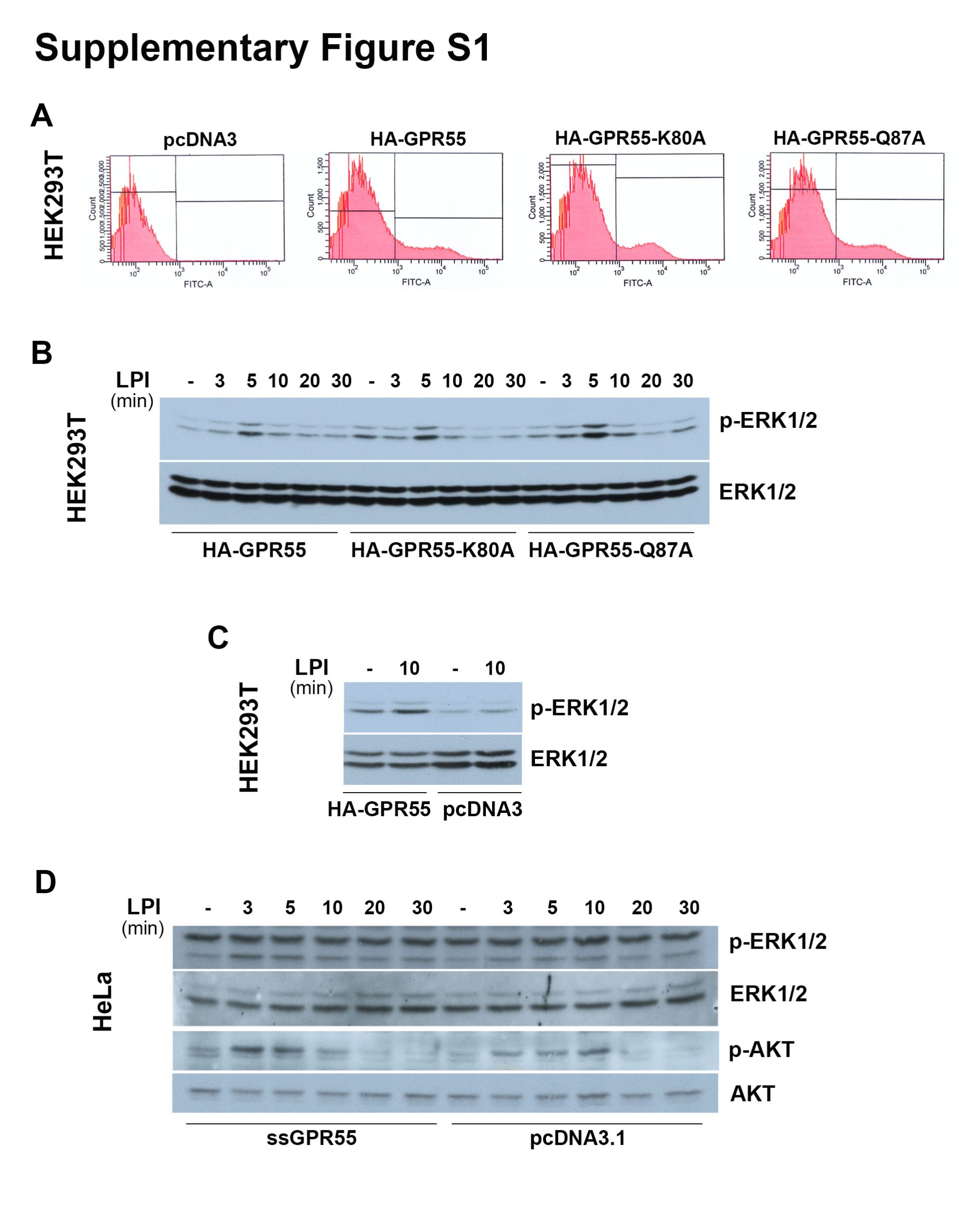 On this basis, we initially generated GPR55 alanine mutants of its most relevant LPI-binding residues: GPR55-K80A and GPR55-Q87A. Functional evaluation of these mutant proteins was carried out by transient transfection of HEK293T cells with constructs that coded for the HA-tagged human GPR55 proteins, as wild-type or mutated. When all of these showed similar cell-surface levels, as verified by FACS analysis (Additional file 3: Figure S1A), LPI stimulation induced comparable activation kinetics of ERK1/2 in all of the transfectants (Additional file 3: Figure S1B). Under these assay conditions, not only the GPR55-transfected, but also the empty-vector-transfected HEK293T cells showed LPI-stimulated increased phosphorylation of ERK1/2 (Additional file 3: Figure S1C).