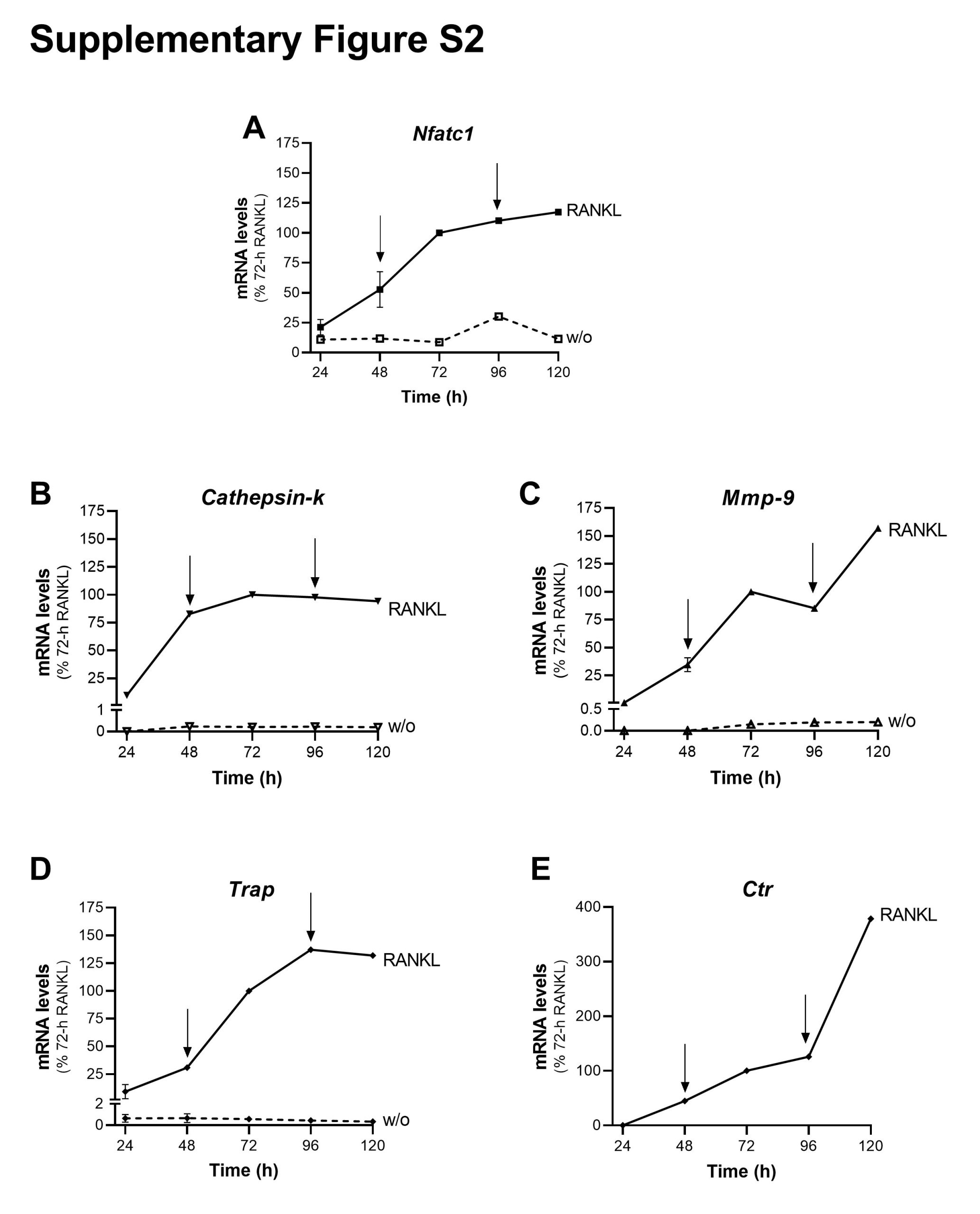 - Additional file 4. Figure S2. Osteoclastogenesis markers expression during differentiation of RAW264.7 precursors. Time-courses of Nfatc1, Cathepsin-k, Mmp-9, Trap, and Ctr mRNA expression levels during osteoclast differentiation of precursor RAW264.7 cells induced by 30 ng/mL RANKL. RANKL was added at time 0 and every 48 h (arrows). Transcripts were quantified by real-time PCR and normalised for β2-microglobulin expression, as the housekeeping gene. Data are means ±range from two independent experiments, and are expressed as percentages of the mRNA levels at 72 h of RANKL treatment for each marker. At this time in RANKL-treated cells compared to the undifferentiated cells Nfatc1 was increased by 11.9 (±2.2)-fold, Cathepsin-k by 468.5 (±24.3)-fold, Mmp-9 by 673.3 (±4.7)-fold, and Trap by 188.8 (±57.6)-fold. Ctr was not expressed in undifferentiated cells at any of the times analysed here. w/o, cells incubated without RANKL. (JPG)