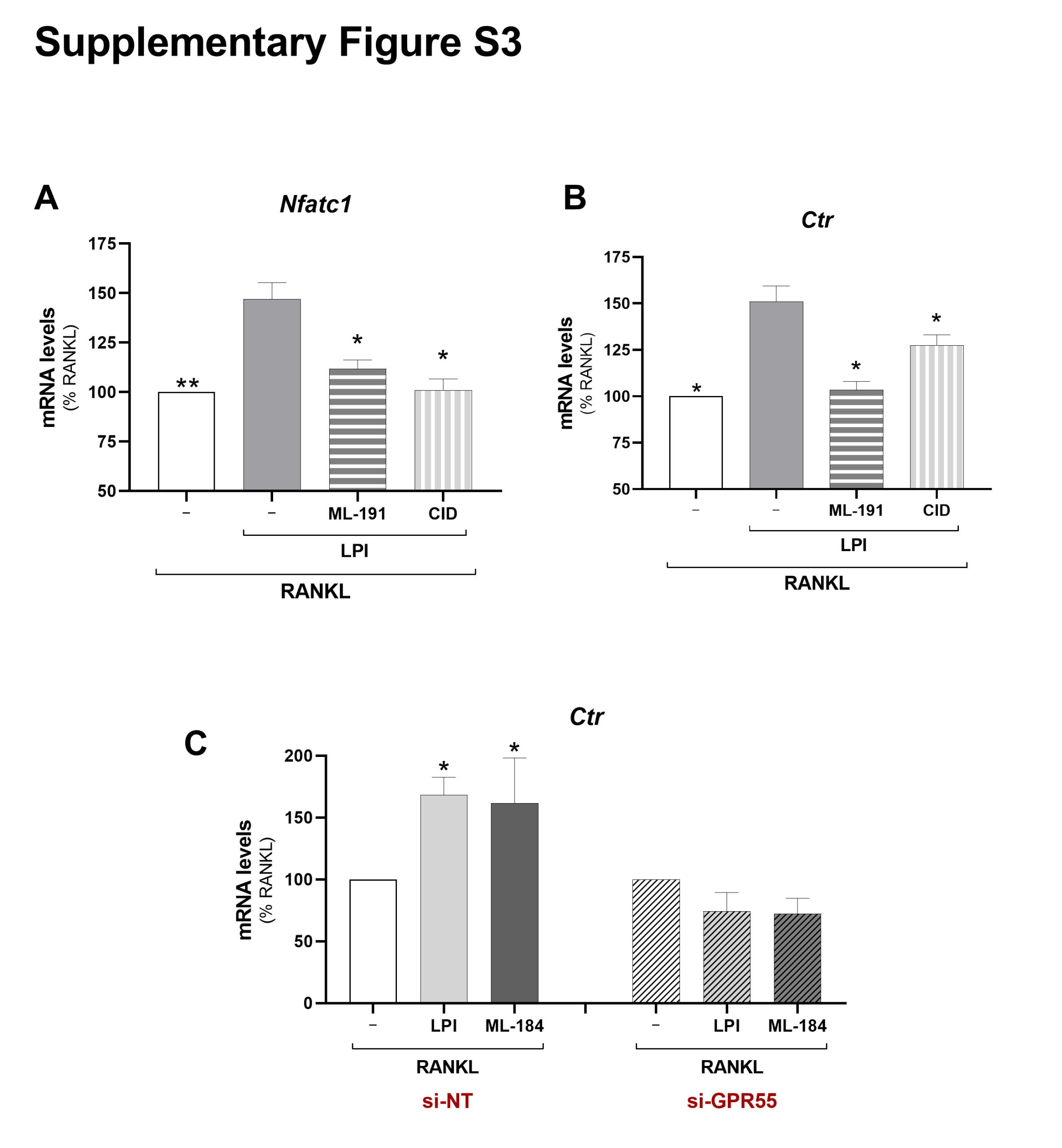 - Additional file 5. Figure S3. Effects of GPR55 modulators on osteoclast maturation. (a, b) Real-time PCR analysis of the differentiation markers (as indicated) in RAW264.7 cells treated with 15 ng/mL RANKL for 72 h, in the absence or presence of 1 µM soybean LPI alone or with GPR55 antagonists (0.5 µM ML-191; 0.5 µM CID16020046). (c) Real-time PCR analysis of Ctr in RAW264.7 cells interfered with non-targeting (si-NT) or Gpr55-targeting (si-GPR55) siRNAs, and subsequently treated with 15 ng/mL RANKL for 72 h in the absence or presence of 1 µM soybean LPI or 1 µM ML-184. The transcripts were quantified and normalised using β2-microglobulin expression, as the housekeeping gene. Data are expressed as proportions (%) of the corresponding control RANKL, as means ±SEM from at least three independent experiments. *p <0.05, **p <0.01 (Student’s t-tests). RANKL, RANKL-differentiated cells. CID, CID16020046. (JPG)