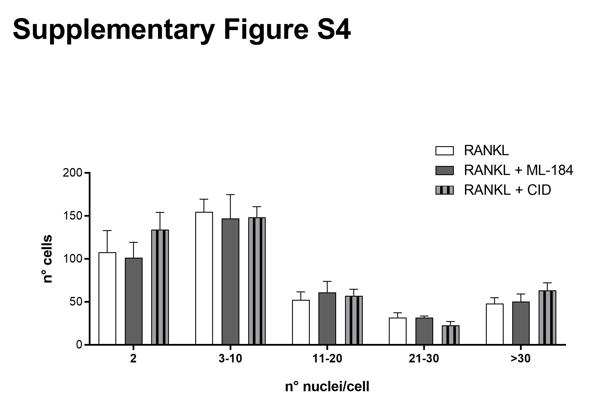 - Additional file 6. Figure S4. Effects of GPR55 modulators on the osteoclast syncytia. RAW264.7 cells were treated with 15 ng/mL RANKL in the absence or presence of the GPR55 antagonist/agonist (1 µM ML-184, 0.5 µM CID16020046). Osteoclast syncytium formation was determined after 72 h of RANKL treatment, as number of nuclei/cell, under fluorescence microscopy. Data are means ±SE of three independent experiments. RANKL, RANKL-differentiated cells; CID, CID16020046. (JPG)
