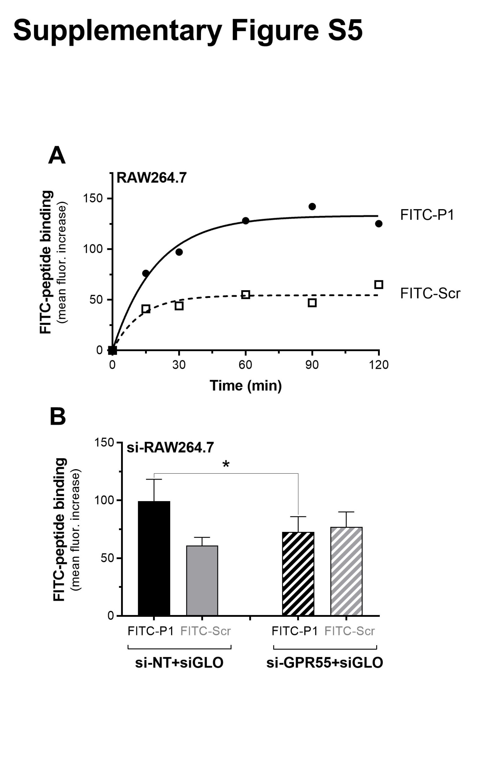 - Additional file 7. Figure S5. Peptide-P1 specifically binds to murine GPR55 in RAW264.7 cells. (a) Time course of binding of 40 µg/mL (26.8 µM) FITC-conjugated Peptide-P1 (FITC-P1) or the scrambled (KCLTSNCPK) peptide (FITC-Scr) to RAW264.7 cells at 37 °C. Peptide binding evaluated in subsequent FACS analysis of cell-associated FITC-fluorescence is shown, quantified as mean fluorescence increase compared to cells incubated in the absence of any peptide, with data representative of three independent experiments. The extrapolated apparent Kd for FITC-P1 was 22.7 µM. (b) Peptide specificity towards GPR55 was determined by incubation of 40 µg/mL FITC-labelled peptides with RAW264.7 cells treated with non-targeting (si-NT+siGLO) or Gpr55-targeting (si-GPR55+siGLO) siRNAs for 15 min at 37 °C. Peptide binding was subsequently evaluated by FACS analysis of cell-associated FITC fluorescence in the siGLO-positive cells, quantified as mean fluorescence increase compared to cells incubated in the absence of any peptide (see Methods). Data are means ±SEM of four independent experiments. *p <0.05 (Student’s t-test). (JPG)