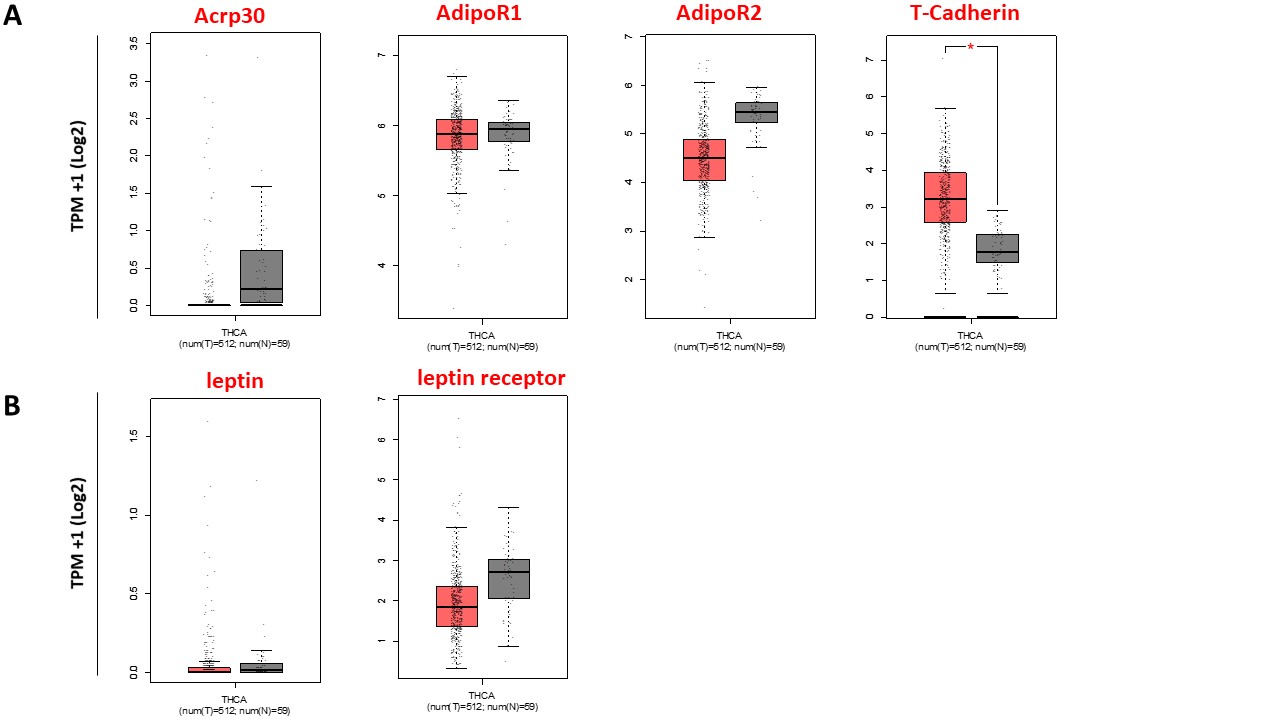 - Expression level of Acrp30, leptin and of their receptors in human thyroid cancer tissues. The expression level of Acrp30 and of its receptors (AdipoR1, AdipoR2 and T-Cadherin) (A) and the expression level of leptin and its receptor (B) was observed in 512 thyroid cancer tissues in comparison to 59 normal thyroid tissues deposited by TCGA-THCA using GEPIA web server (http://gepia.cancerpku.cn). Box plot shows the expression of the indicated mRNA reposted as log2 (TPM + 1) transformed expression data. For the statistical analysis one-way ANOVA was performed, using disease state (Tumor or Normal) as variable for calculating differential expression. * p < 0.05. (JPG 80 kb) (JPG)