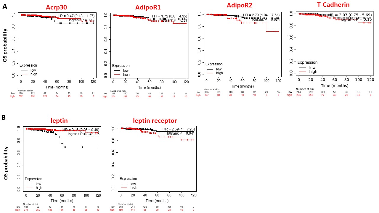- Overall survival (OS) probability of Acrp30, leptin and their receptors in thyroid cancer patients. The prognostic value of Acrp30 and its receptors (A) and of leptin and leptin receptor (B) was evaluated in thyroid cancer patients. In each panel it is reported the Kaplan–Meier survival plot, with hazard ratio (HRs) and p-values (log-rank test) for two patient cohorts: red and black color indicated patients with high or low level of the genes respectively. (JPG 122 kb) (JPG)