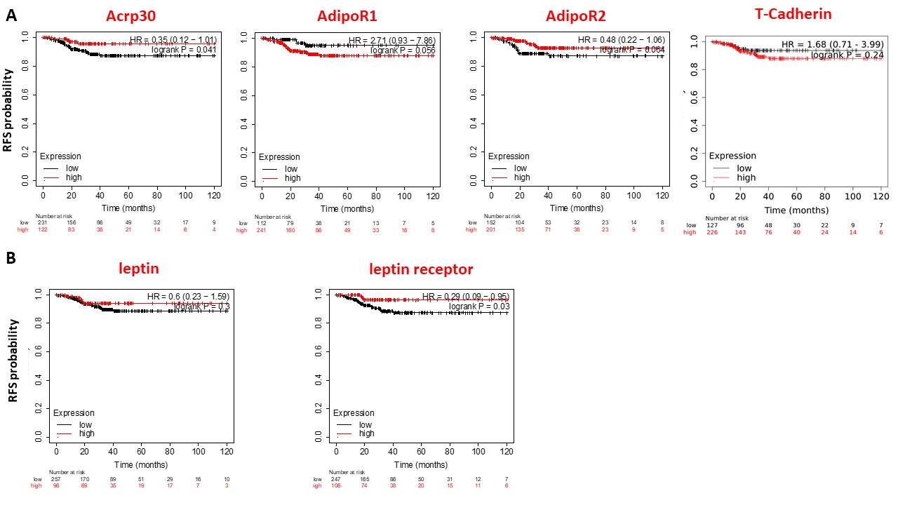 - Relapse-free survival (RFS) probability of Acrp30, leptin and their receptors in thyroid cancer patients. Kaplan–Meier curves showed the RFS probability thyroid cancers for Acrp30 and its receptors (A) and of leptin and leptin receptor (B). Patients were split in two different cohorts: low (indicated by black color) and high (indicated by red color) on the base of the gene expression level. (JPG 127 kb) (JPG)
