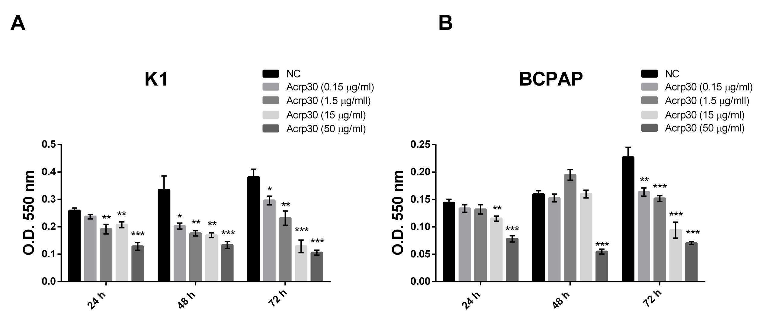 - Acrp30 reduces viability of PTC cell lines in a time and dose-dependent manner. Cell viability of K1 and of BCPAP cell lines (A and B, respectively) was assessed by MTT assay after 24, 48 and 72 hours of treatment with various doses of Acrp30 (0.15, 1.5, 15, 50 μg/ml). Untreated cells, grown in DMEM 5% FBS, were used as negative control (NC). Values are expressed as mean of replicates ± standard error of the mean (SEM). * p < 0.05; ** p < 0.01; *** p < 0.001 versus NC. (JPG 1019 kb) (JPG)