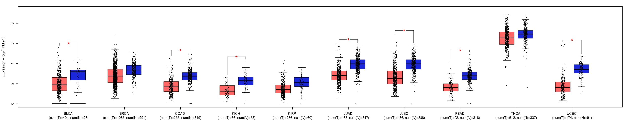 - Additional file 1. Figure S1 Hhex was downregulated in lung cancer cells. Box plots of Hhex mRNA levels determined in BLCA, BRCA, COAD, KICH, KIRP, LUAD, LUSC, READ, THCA and UCEC, compared to normal tissues in the GEPIA database (***P < 0.001; P-values were obtained using two-tailed Student’s t-tests). BLCA: Bladder Urothelial Carcinoma; BRCA: Breast invasive carcinoma; COAD: Colon adenocarcinoma; KICH: Kidney Chromophobe; KIRP: Kidney renal papillary cell carcinoma; LUAD: Lung adenocarcinoma; LUSC: Lung squamous cell carcinoma; READ: Rectum adenocarcinoma; THCA: Thyroid carcinoma; UCEC: Uterine Corpus Endometrial Carcinoma. (TIF)