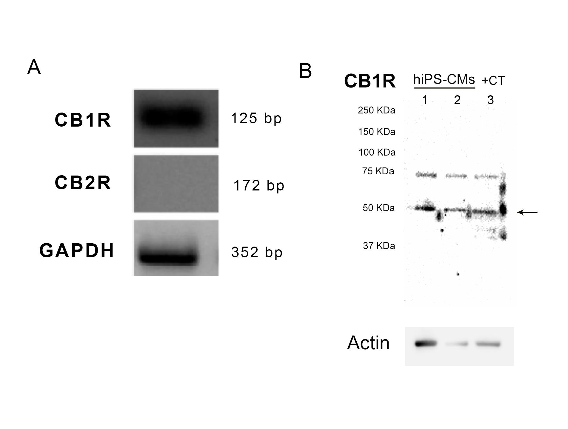 - CB1 and CB2 receptors expression.(A) The figure shows agarose gel of end-point PCR products for cDNA from hiPSC-CMs. One single specific band was detected for CB1 receptor (125 bp), while no such band was detected for CB2 receptor (172 bp). GAPDH (352 bp) was used as an endogenous control to confirm efficiency of the amplification reaction and quality of cDNA template. Data from two independent experiments. (B) Western blot detection of CB1 receptor protein levels in hiPSC-CMs. The arrows indicate the specific bands, corresponding to the molecular weight predicted to CB1 receptor. hiPSC-CMs samples were taken from different passages and the positive control (CT) was from tissue homogenates of adult Black C57/BL6 mouse hippocampus. (PNG)