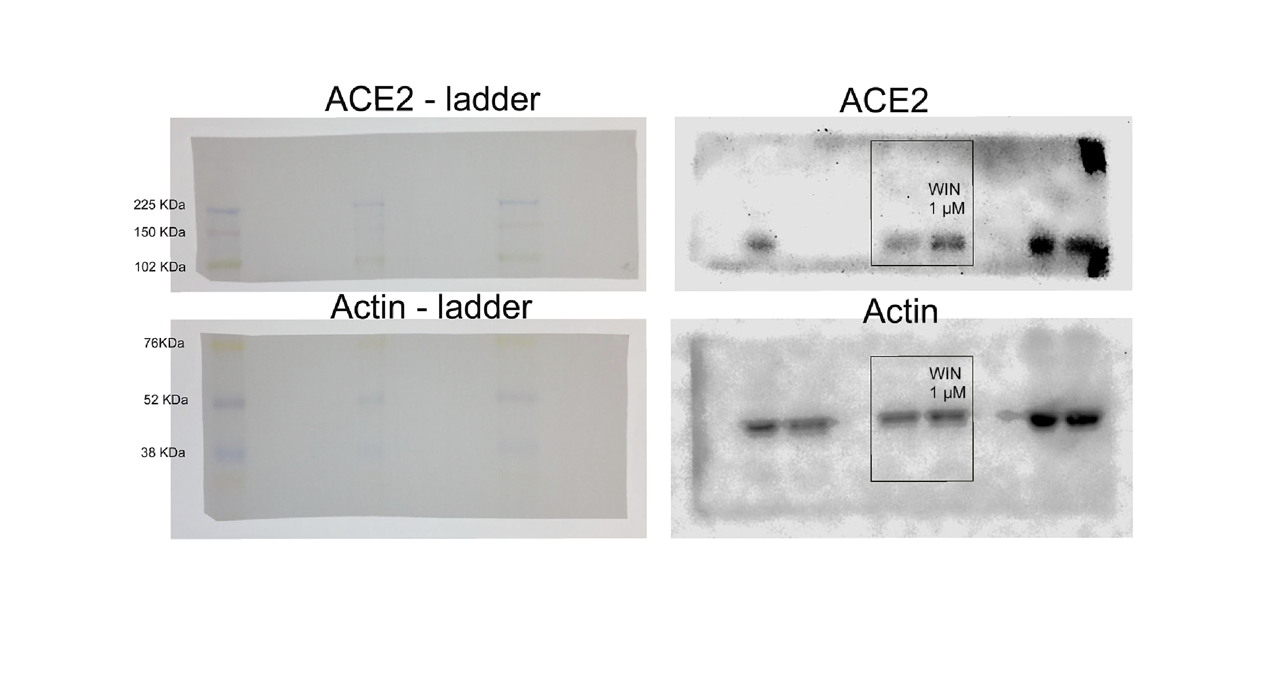 - Full lenght uncropped blot from <xref rid="fig-1" ref-type="fig">Fig. 1</xref>.After transference the membrane was cut, the upper half used for ACE2 detection, and the bottom half used for actin detection. Images of the membranes used for detection with the ladder (Amersham ECL Rainbow Marker-Full range) are shown on the left. Full-length gels for ACE2 and actin with contrast adjusted to allow visualization of the membrane are shown on the right. Although the whole gel is shown here the lanes used for representative image in Fig. 1 are highlighted in a box. Other lanes have samples that are not related to the experiment in this manuscript. (PNG)