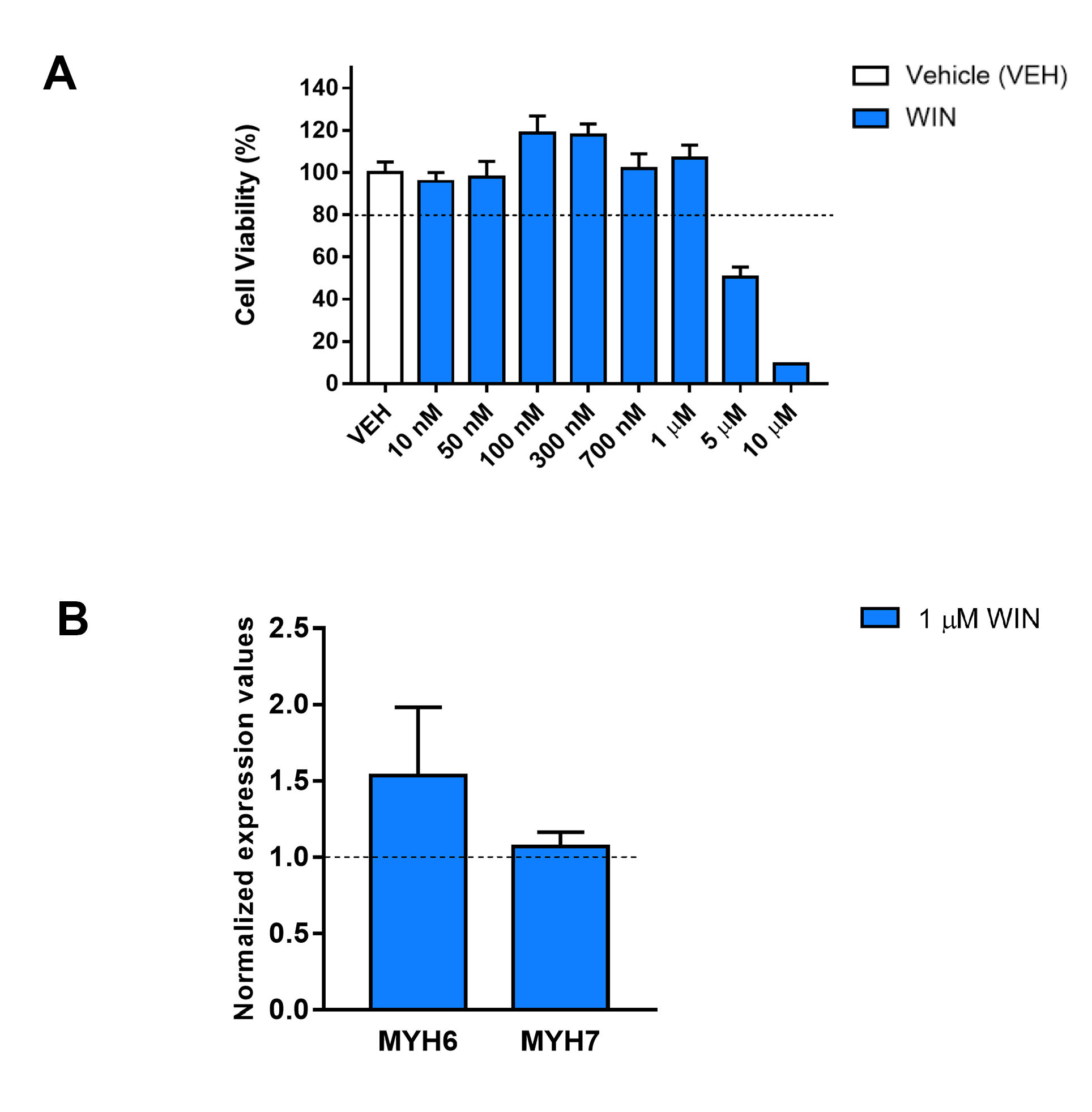 - Cell viability assay and quantitative real‑time PCR for genes correlated to hypertrophy.(A) Neutral red uptake assay from hiPSC-CMs treated with increasing concentrations of WIN for 72 h. The highest non-cytotoxic concentration was one μM. (B). qPCR for MYH6 and MYH7 genes from hiPSC-CMs treated with one μM WIN for 24 h. The MYH6 and MYH7 levels showed no significant differences between WIN-treated and untreated cells. (PNG)