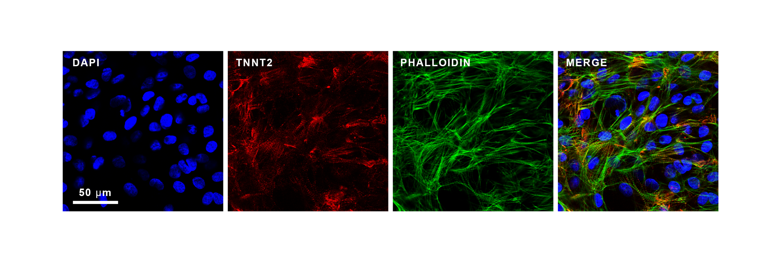 - Micrographs of hiPSC-CMs immunostained for cTnT.hiPSC-CMs were immunostained for TNNT2 (red), filamentous actin (F-actin) (green) by phalloidin staining and counterstained with DAPI (blue); 63 × magnification; Scale bar: 50 μm. (PNG)