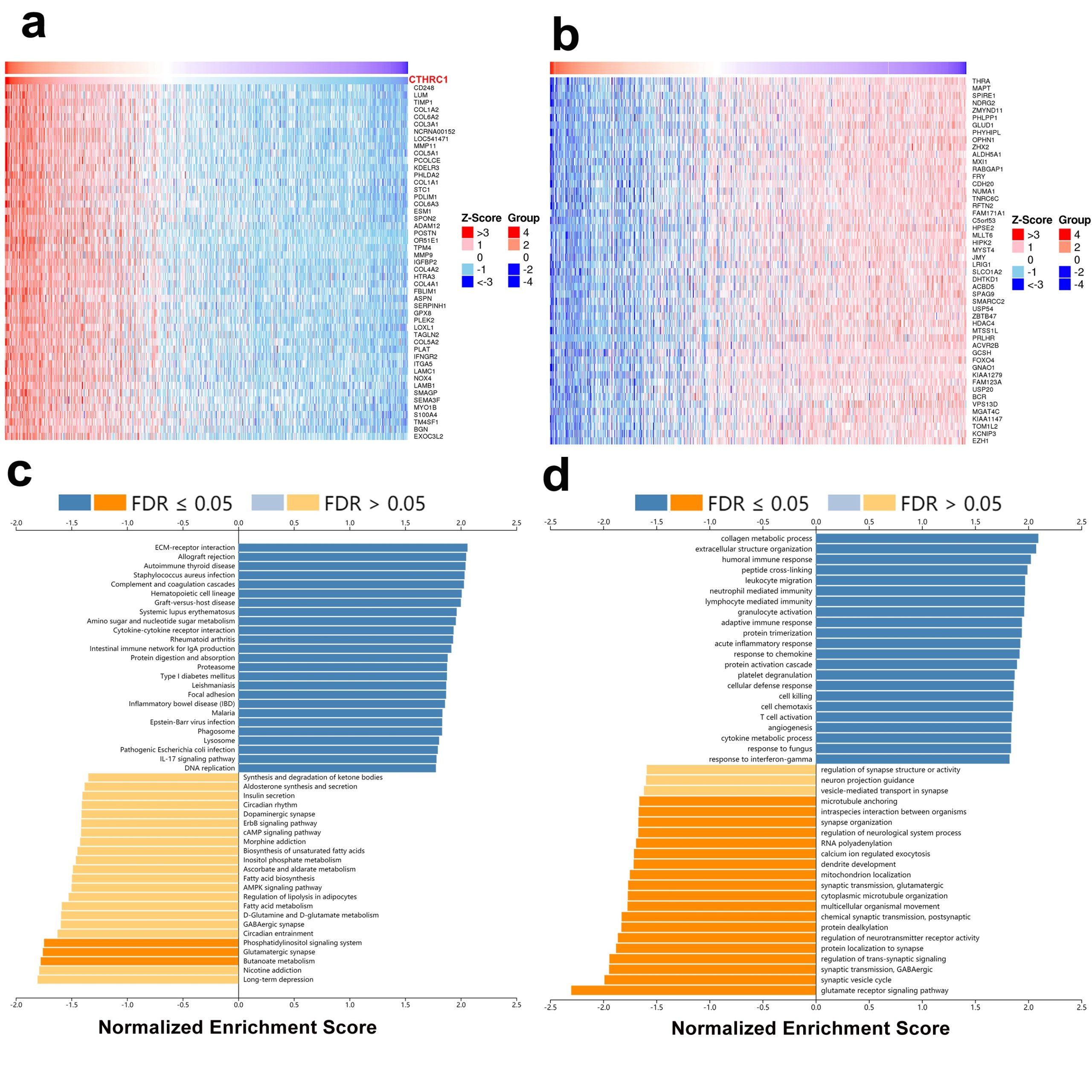 - Additional file 11: Figure S11. CTHRC1 coexpression genes in glioma from LinkedOmics. Heat maps showing top 50 genes positively a and negatively b correlated with CTHRC1 in glioma. Significantly enriched KEGG pathways c and GO annotations d of CTHRC1 coexpression genes in glioma. (TIF)