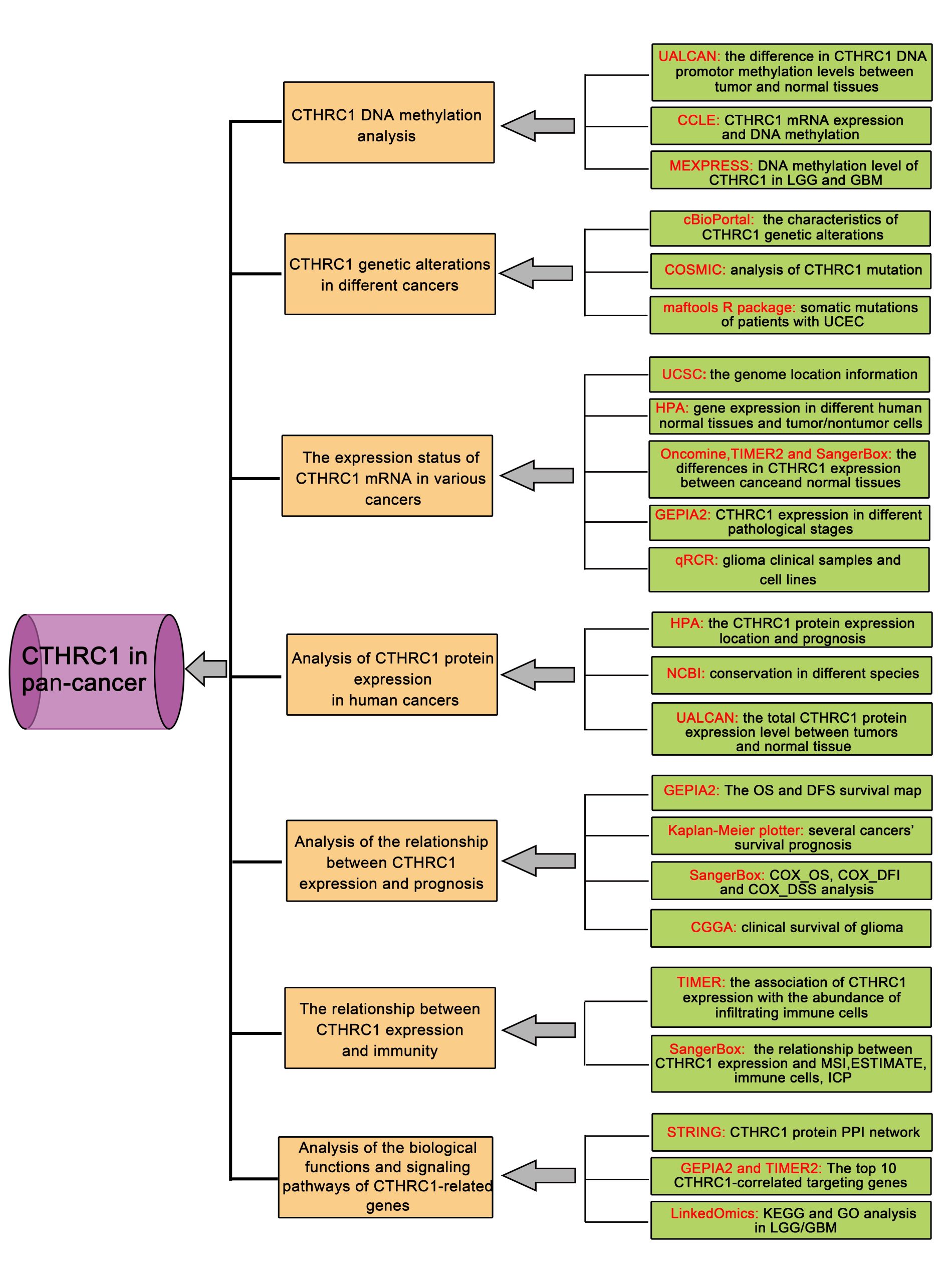 Collectively, our pan-cancer analysis of CTHRC1 first explored the mRNA and protein expression levels, clinical prognosis, gene alterations, DNA methylation levels, immune cells infiltration, and enrichment analyses of CTHRC1, which is beneficial for understanding the function of CTHRC1 in tumorigenesis and development from diverse perspectives. We hope to identify the key targets and regulatory pathways of CTHRC1 and provide a theoretical basis for subsequent molecular targeted therapy.